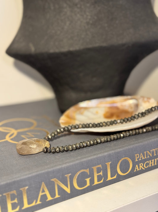 Vintage 925 Sterling Silver Pyrite Rondelle Necklace with Rutilated Quartz Pendant