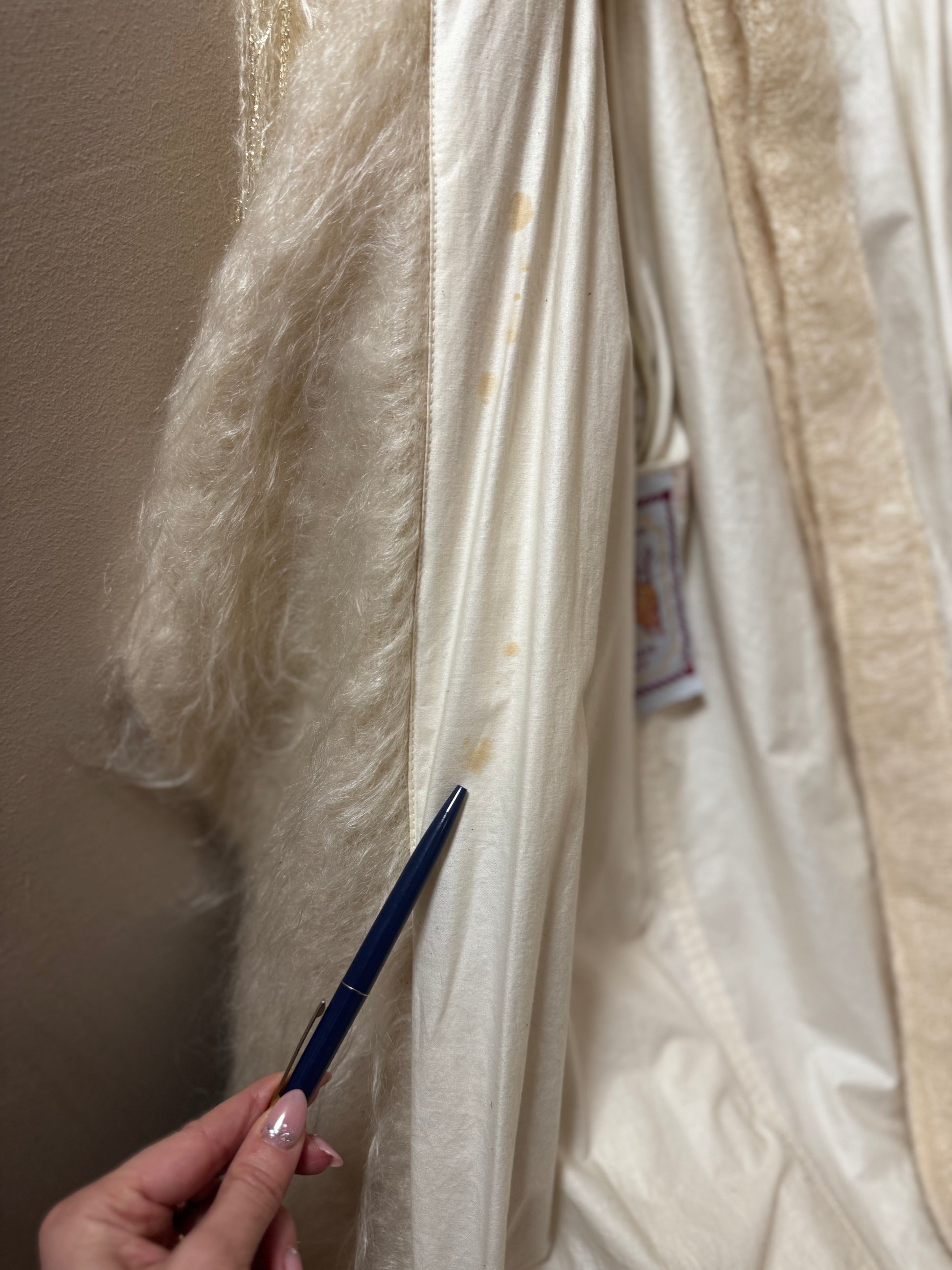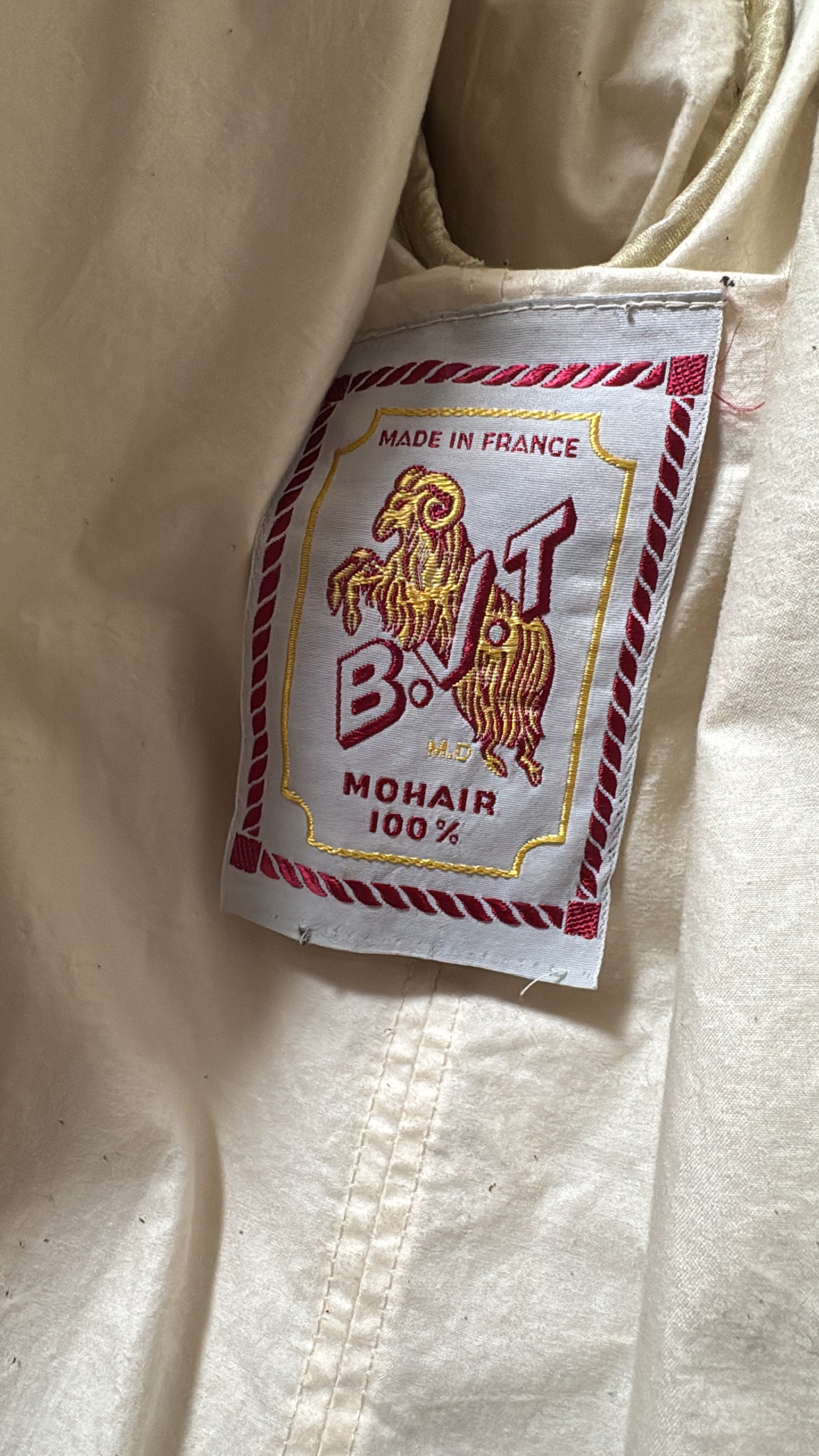 1970s 100% Mohair wrap coat by Jean-Charles de Castelbajac Ko and Co, featuring tinsel trimmed shoulders and a removable belt sash. Fully lined 100% cotton. Excellent vintage condition. No rips, very minimal faint staining on inside lining consistent with age. See pictures for details.