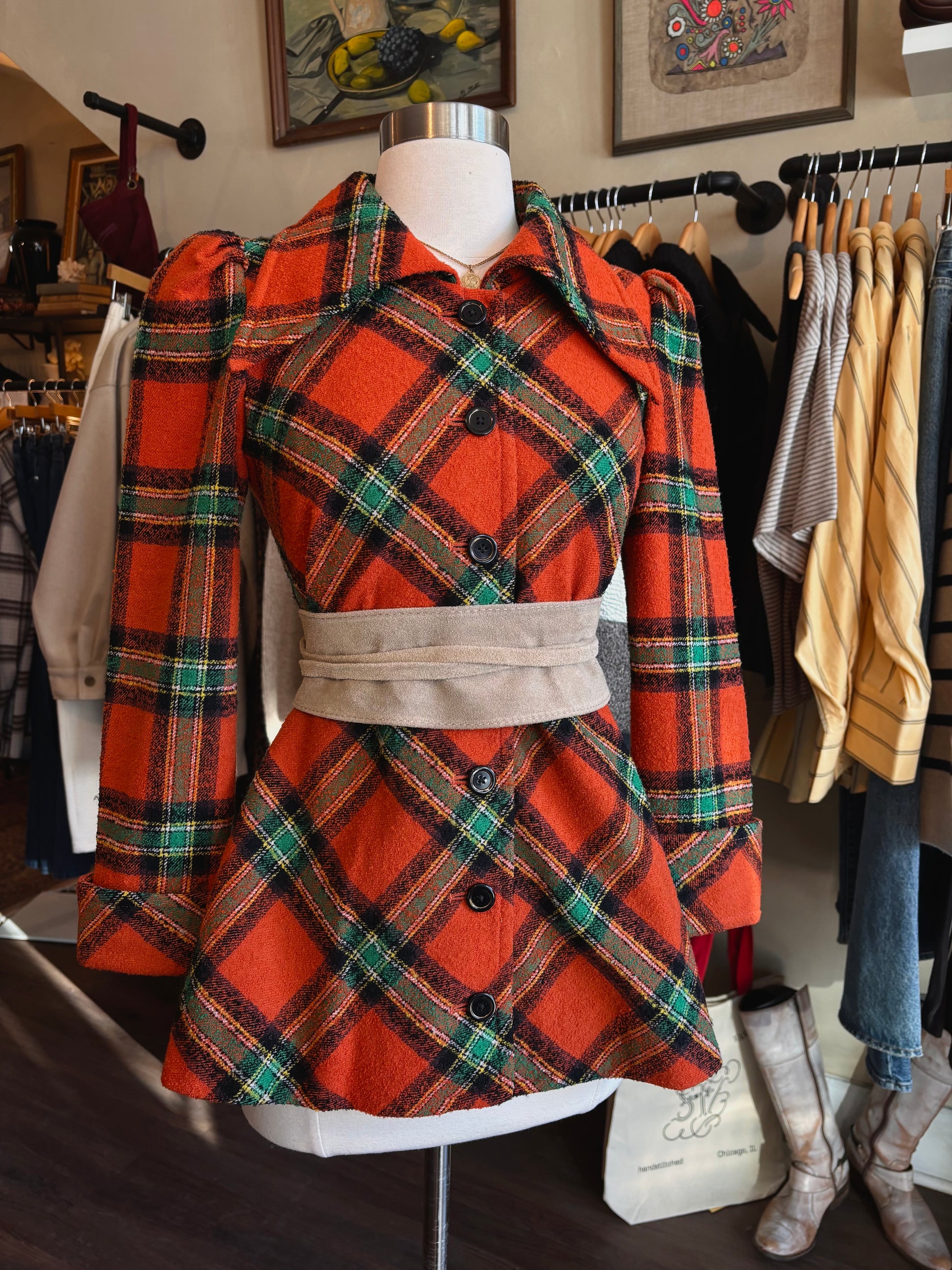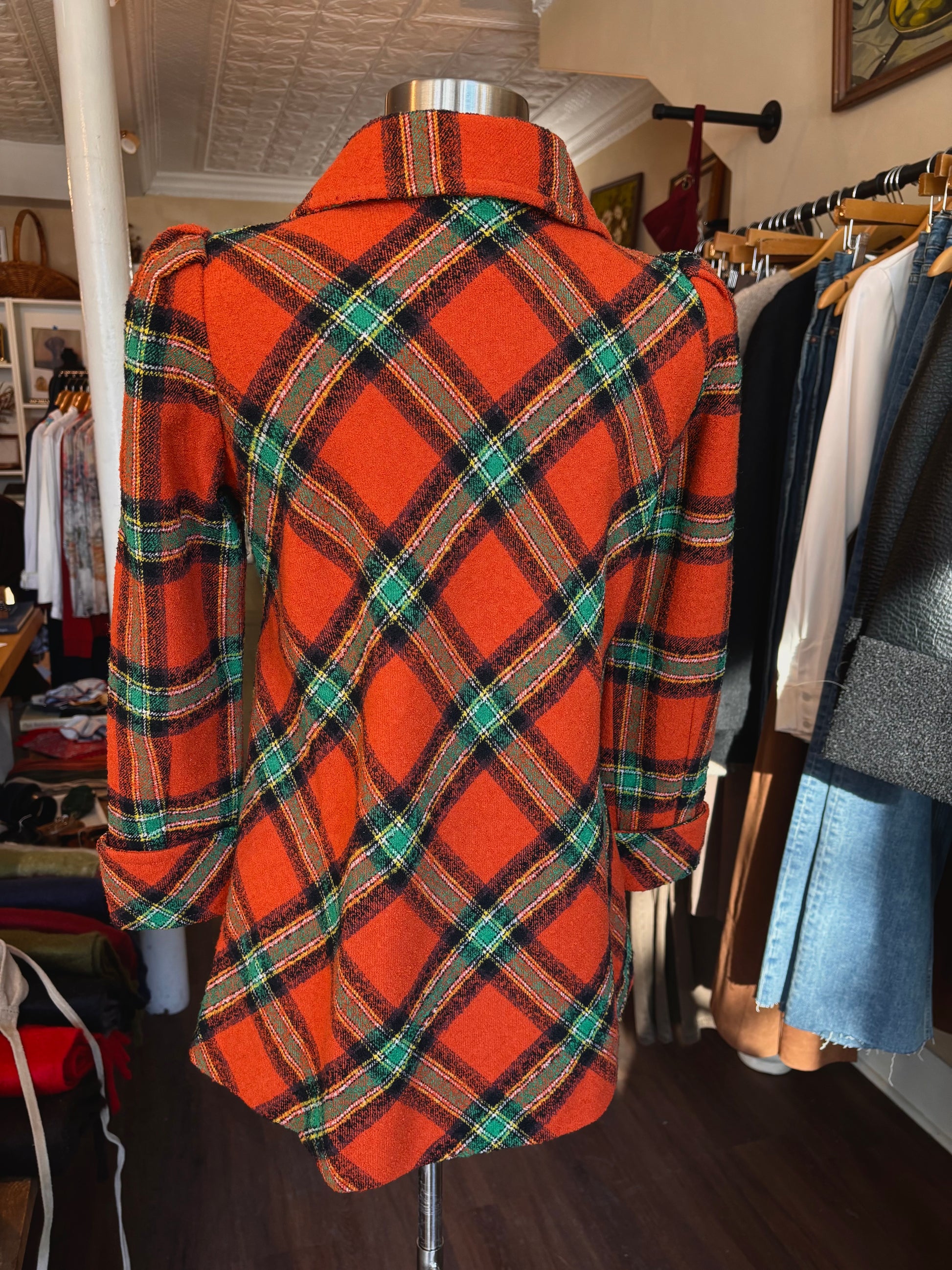 1970's Tokyo Plaid Pea Coat. Features an a-line cut with orange and green plaid print, a butterfly collar and peplum shoulders. Sourced in Namba, Osaka, Japan. In good vintage condition. A minor interior tear on the right shoulder lining. See photos for details.