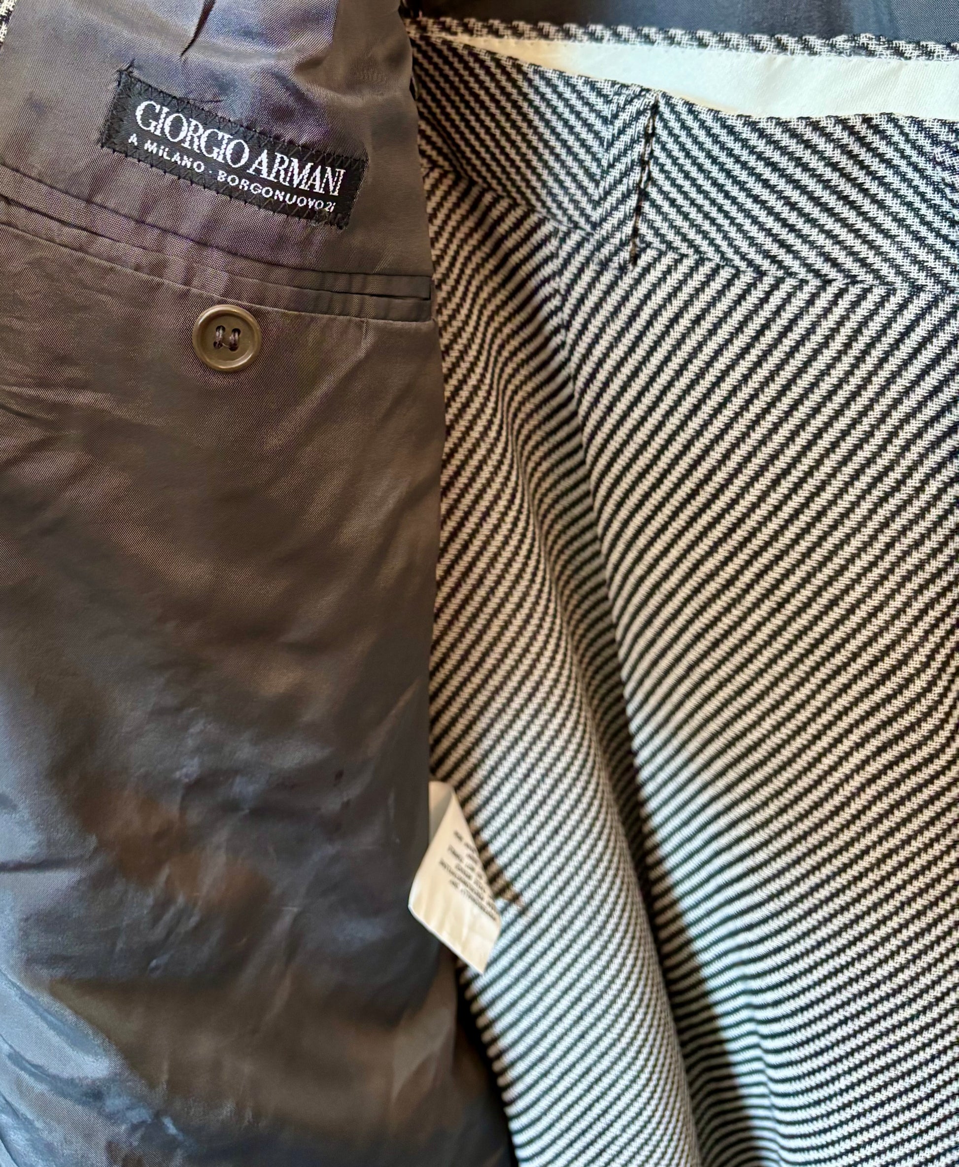 1980's Giorgio Armani blazer and slacks suit set. This suit features a wool/nylon blend with a diagonal striped knit pattern. In excellent vintage condition; no holes or stains, one small pull in the thread. See photos for details