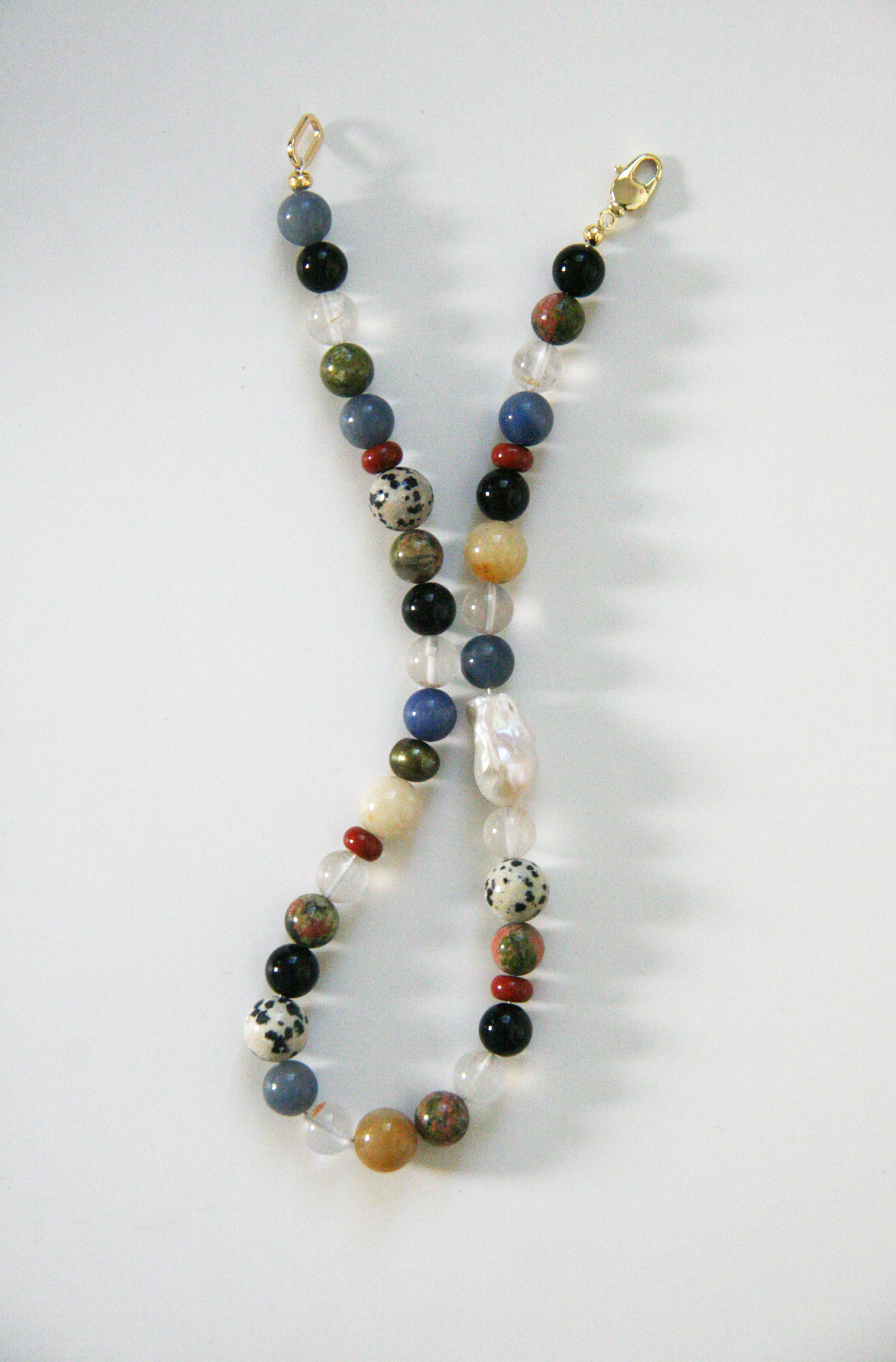 A thoughtfully curated collection of gemstones, showcasing a palette of muted and understated hues. An accented luminous baroque pearl creates contrast to the surrounding gemstones. Varied shapes and sizes offer depth and versatility. * Baroque Pearl, Black Onyx, Blue Aventurine, Red Jasper, Rutilated Quartz, Unakite, Yellow Topaz * 8-12mm Beads * Signature Gold Filled Clasp *Please note there might be slight variations making each piece one of a kind