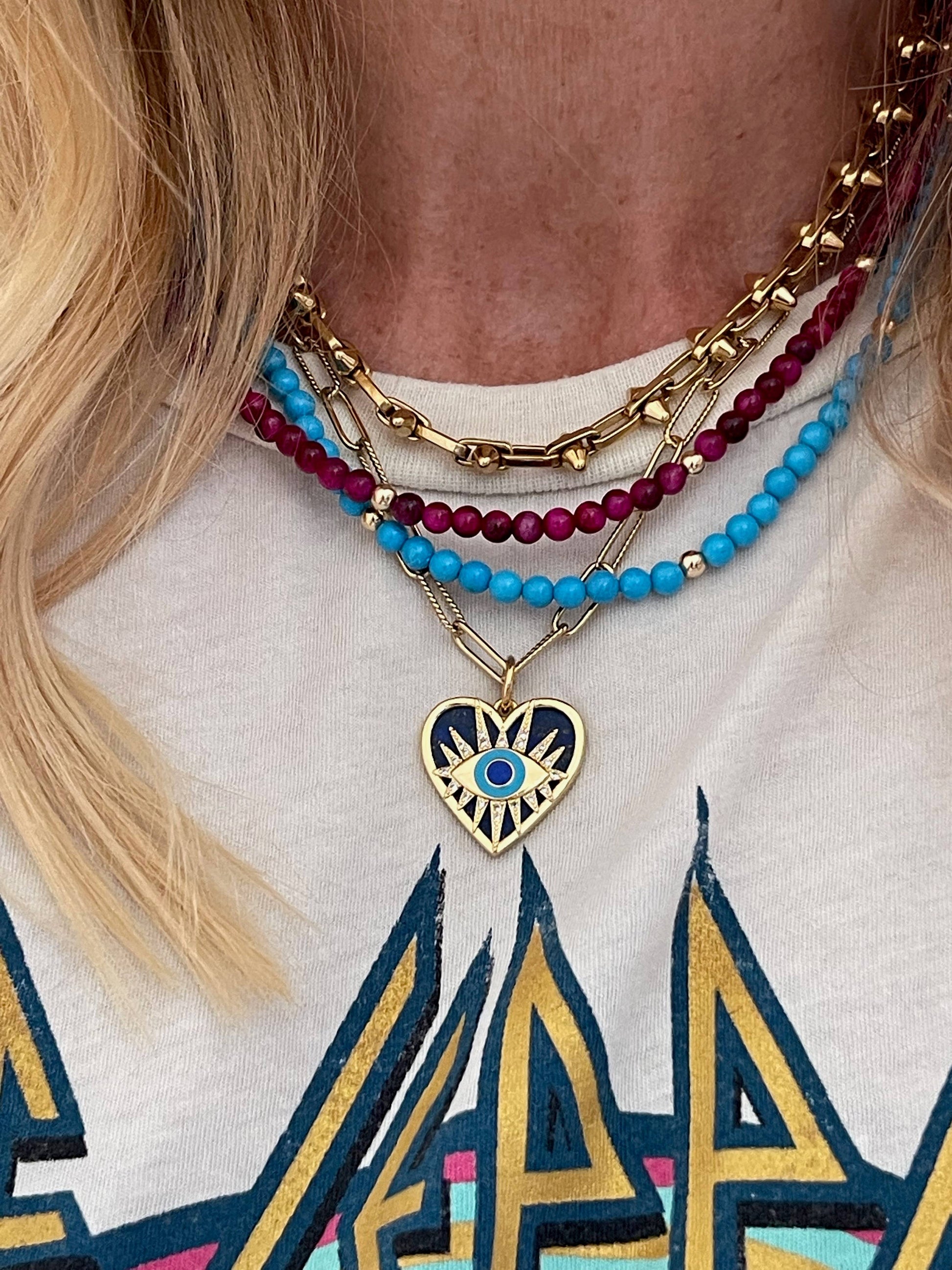 The Alexandrine Necklace is a hand beaded gemstone necklace with gold filled accents. Total length 16”. Looks great solo, but loves to be layered with your favorite chains!