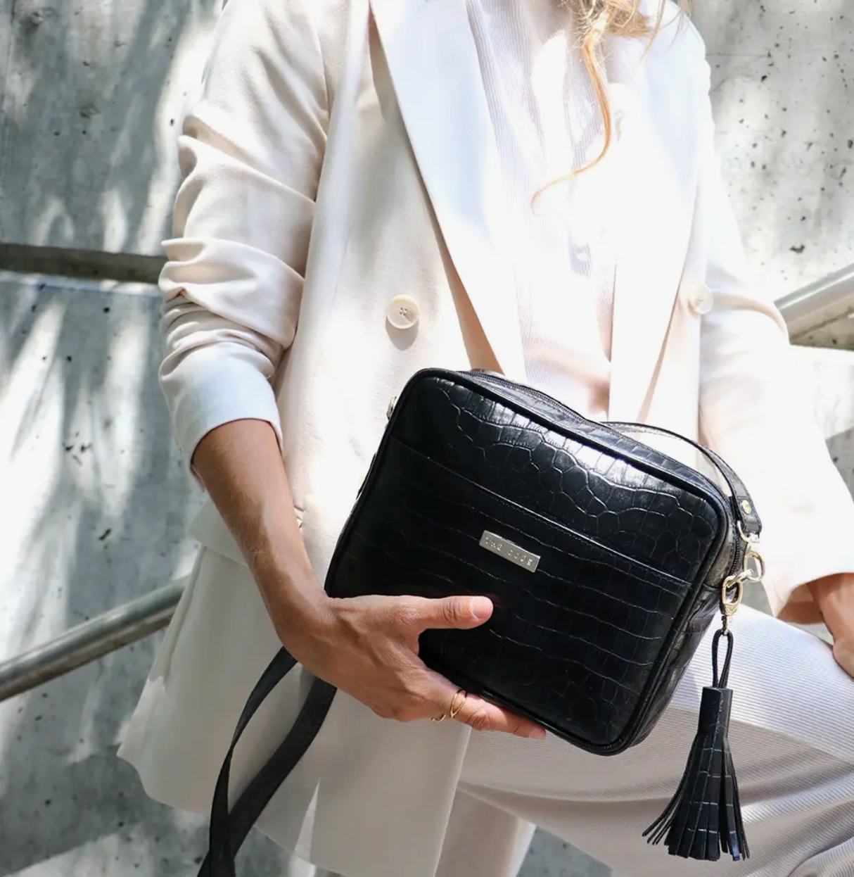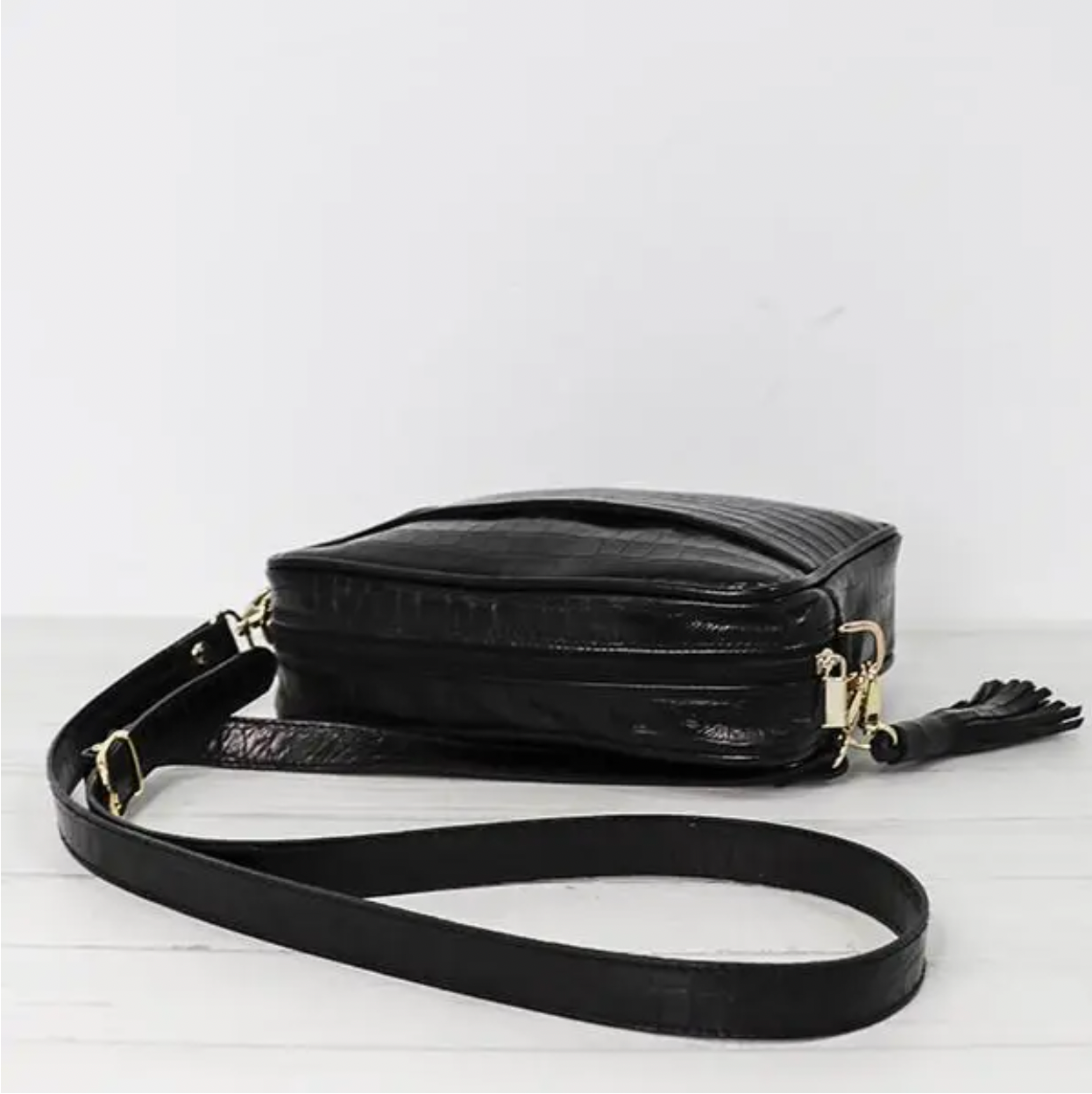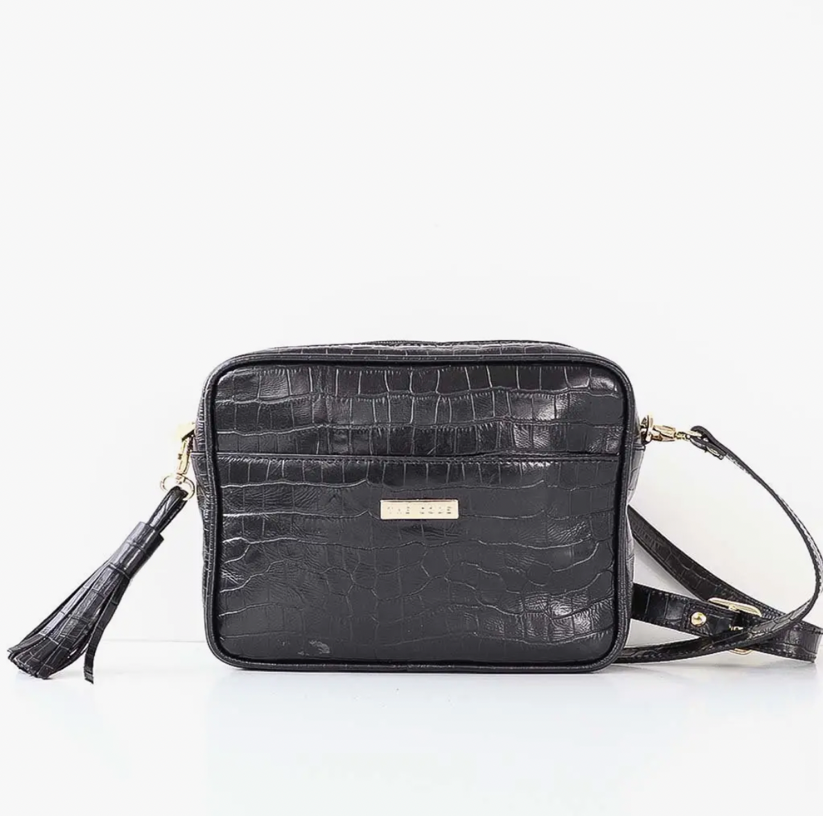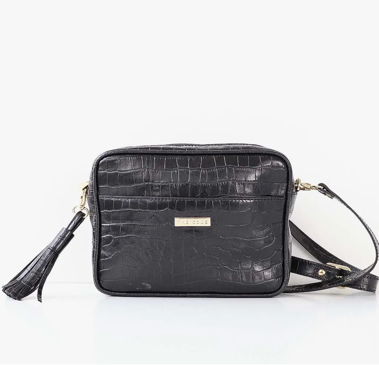 The Carlota Crossbody bag is a square shaped leather crossbody bag with fringe tassel detail and has a front pocket- perfect for the little things you want to keep handy.