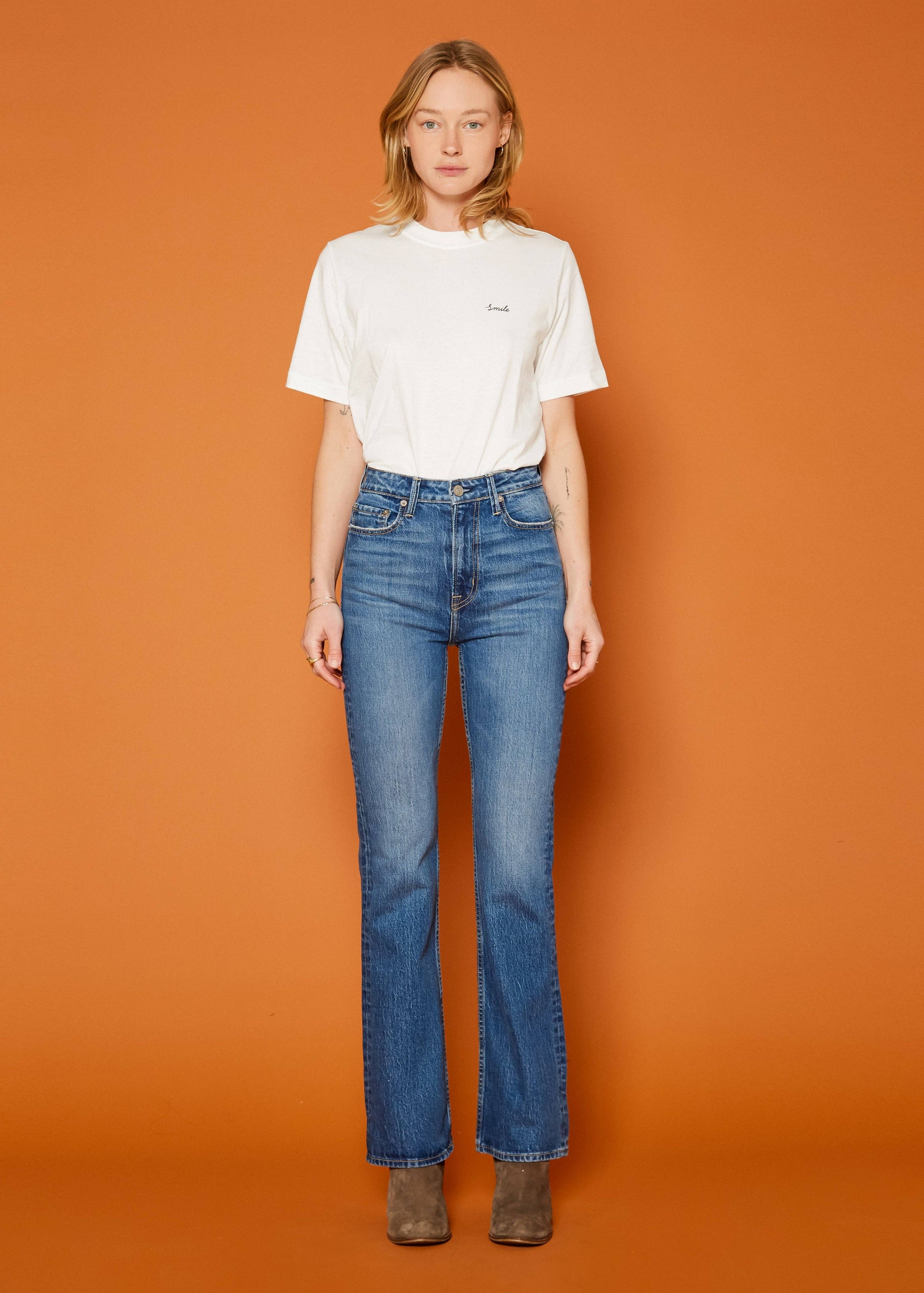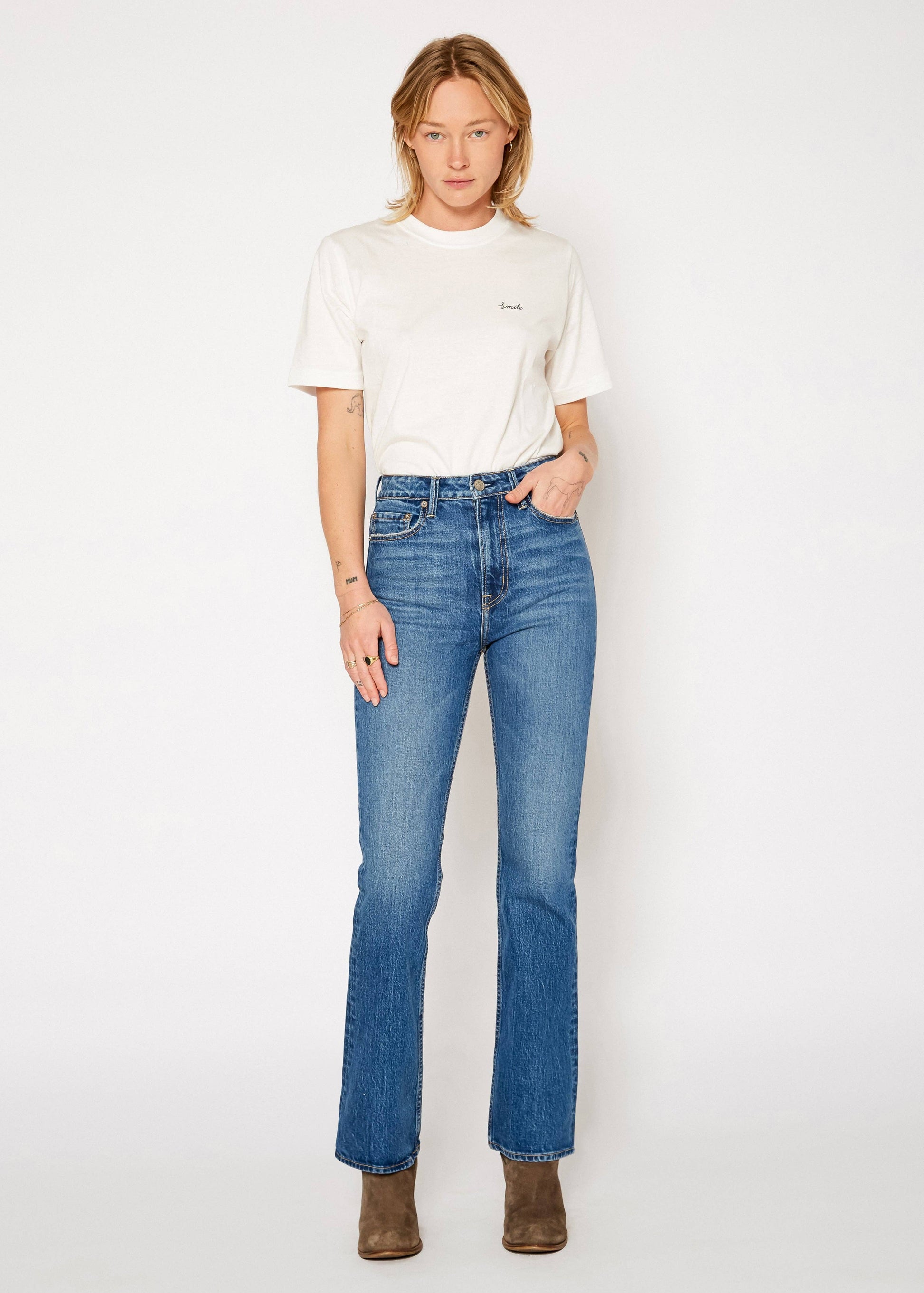 The high rise bootcut shape of the Sloane denim helps to elongate and slim your silhouette for a flattering, polished look.