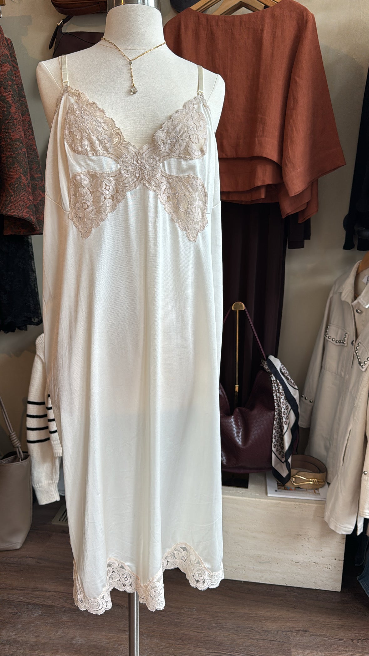 Style Features: v neckline in front with straight backline. Taupe lace detailing in busy area and trim.