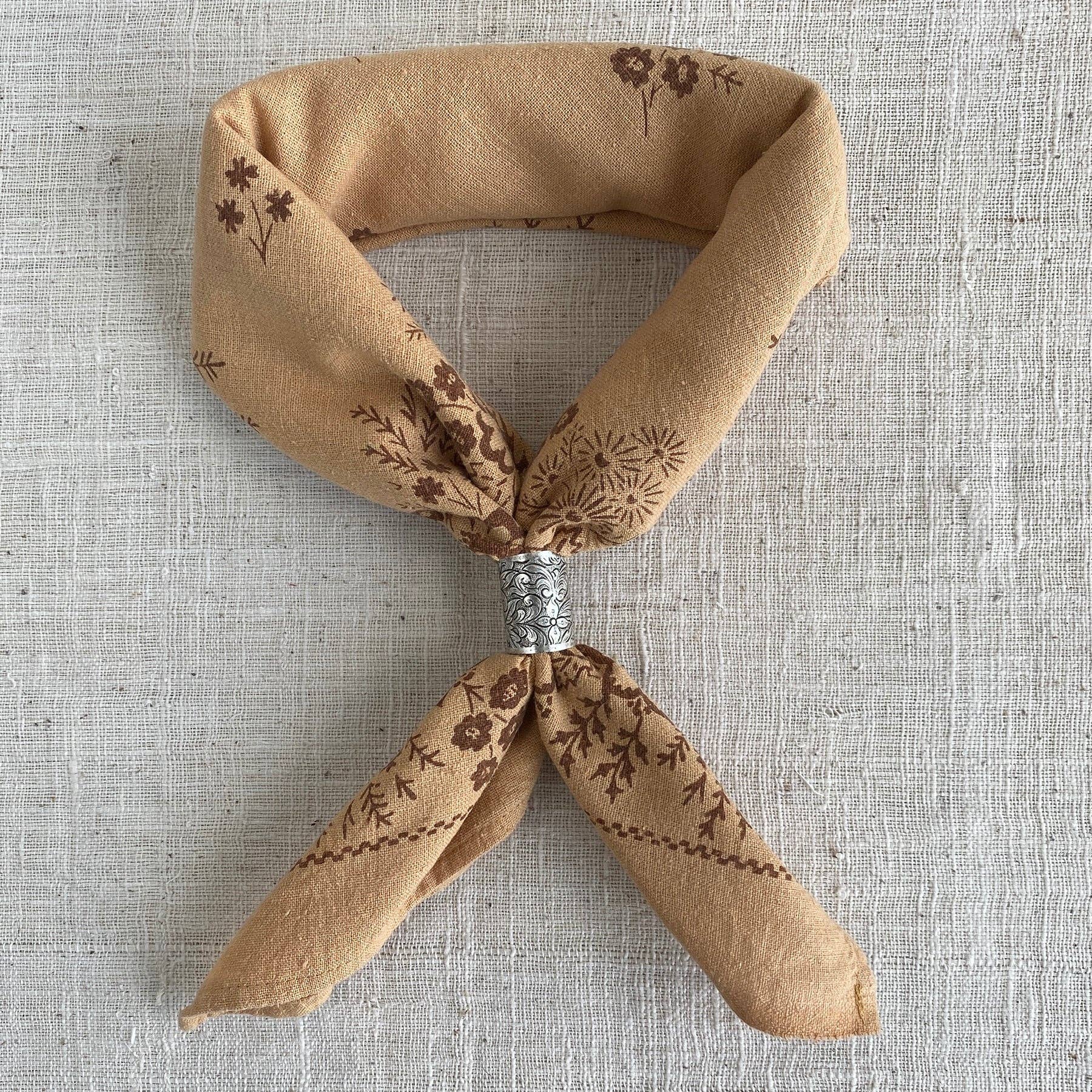 The Dogwood Scarf Slide is a stamped with a beautiful floral motif. The filigree patterning is nod to traditional tooled leather work.