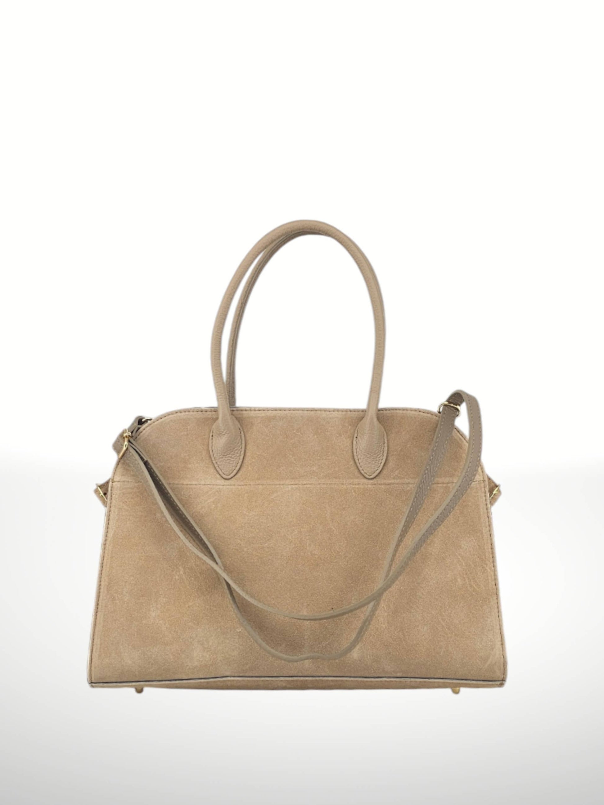The Ismenia suede bag is made of genuine cowhide leather with a suede finish, soft to the touch and structured design. The interior in lined with fabric featuring a spacious main compartment and a zippered pocket. The closure features a top zipper for added security, and a fixed double handle with an adjustable, detachable strap. The bottom is a reinforced base with protective metal studs.