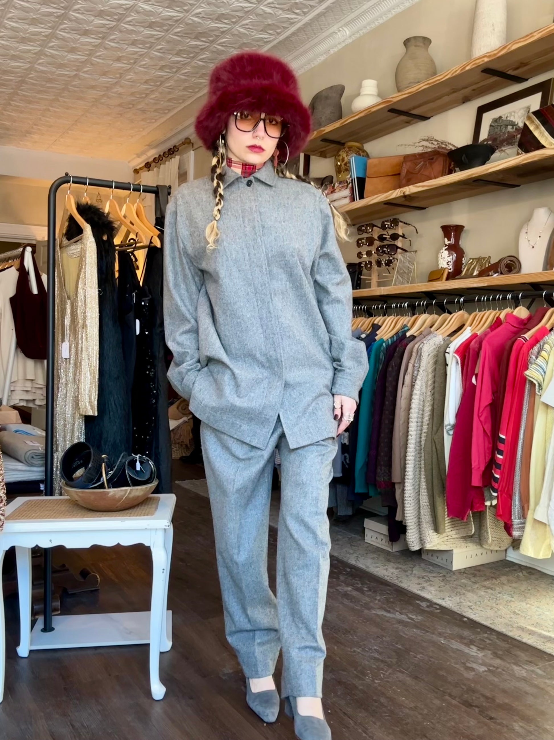 Jil Sander grey wool oversized shirt and slacks set. The pants feature an elastic tie waist. Bought in Berlin, Germany approximately in 2020. Retails for $2,000. In excellent condition with no signs of wear or tear. See photos for details.