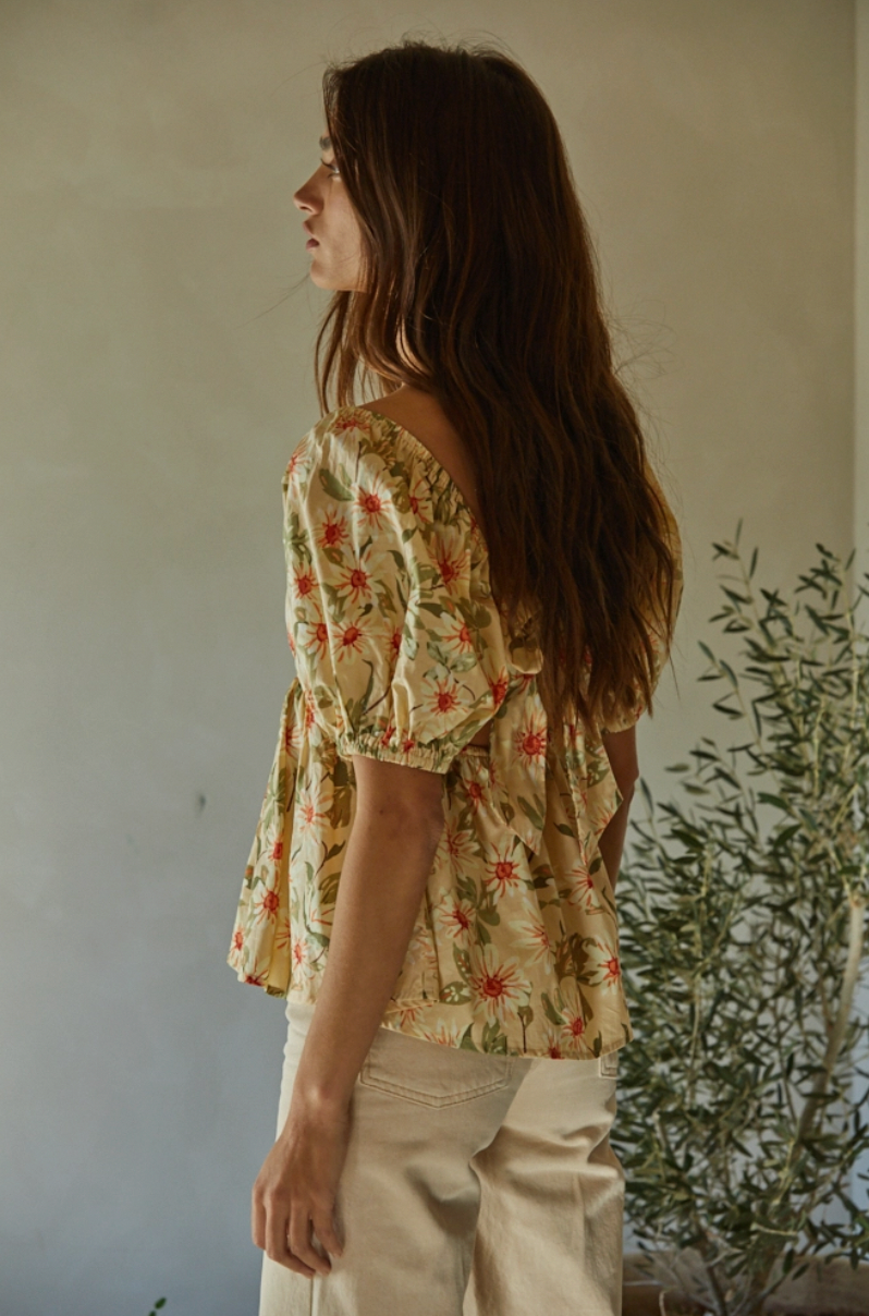A woven cotton floral print top with a sweetheart neckline, short capped sleeve, and a subtly feminine tie in the back
