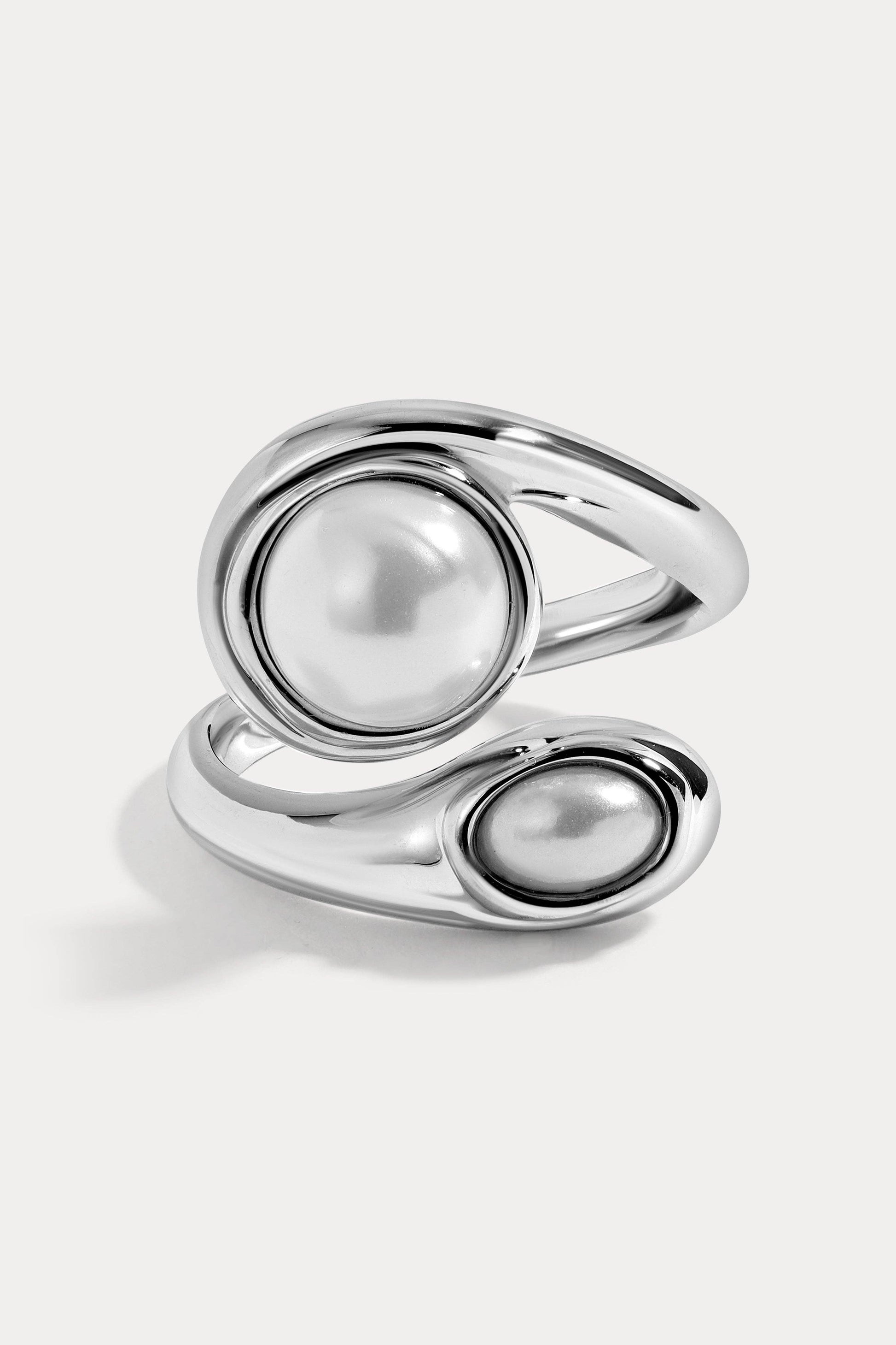 Product Details: Available in 14kt gold plated brass or Rhodium plated brass. Stones are glass pearl, and measure approx. 6.0mm - 8.0mm each. This ring runs true to size.