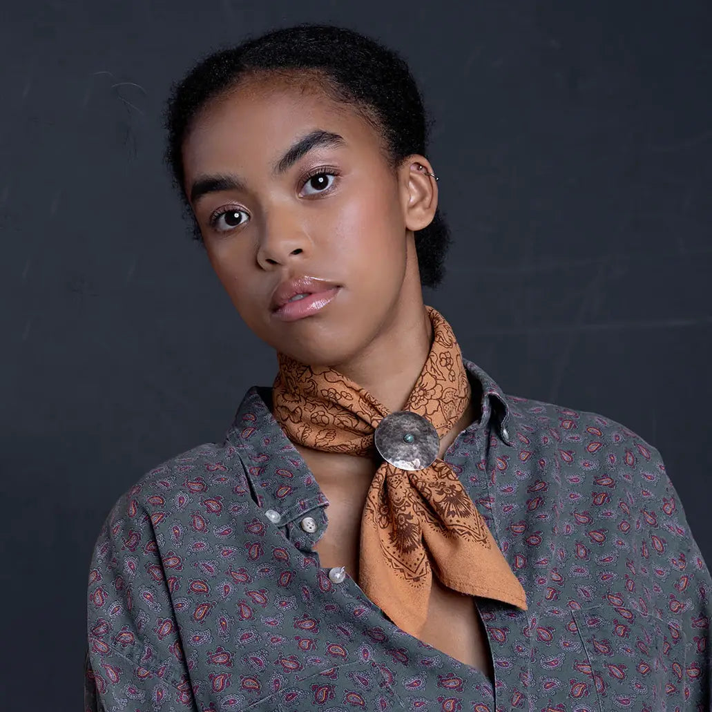 Measures approximately 20” x 20” with a topstitch hem. All Last Chance Textiles scarves are naturally dyed, so the color may vary across pieces. Expect some fading and patina over time, this is inherent to textiles dyed with plants and should be embraced. Variation in dye color, print, and sewing is a testament to the handmade process.