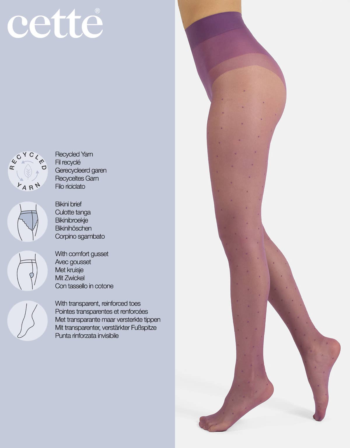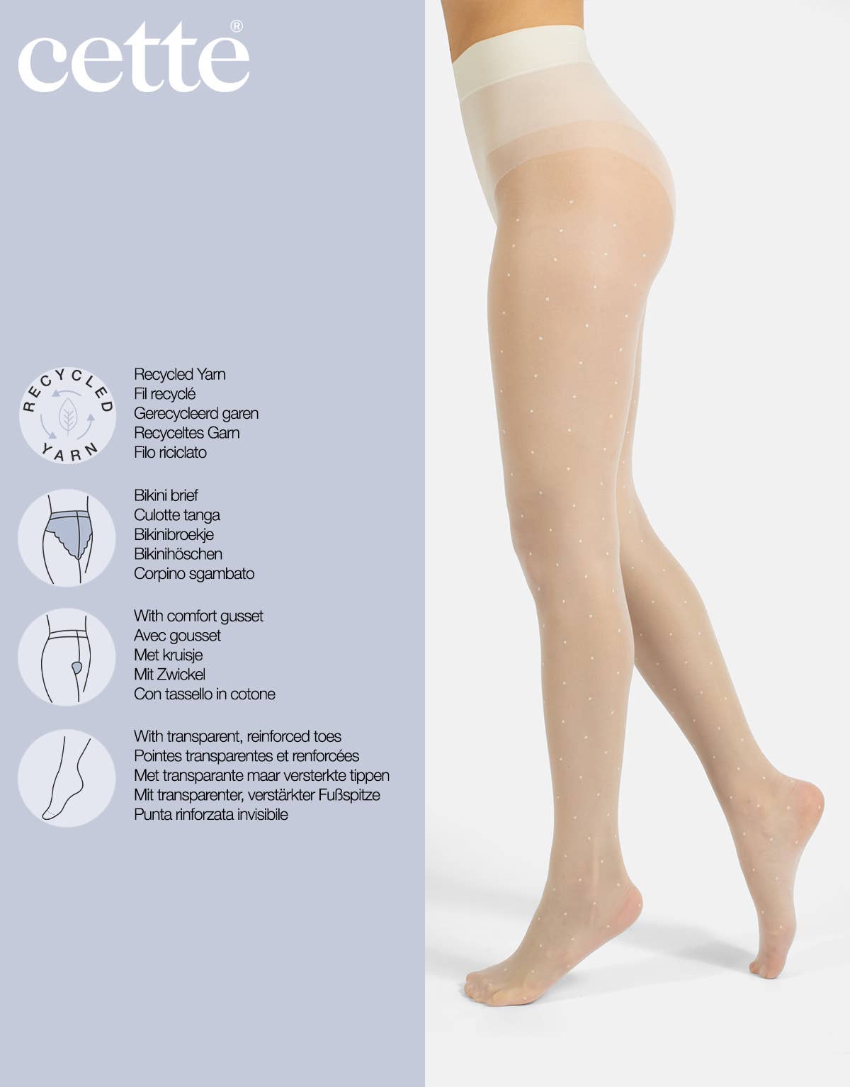 This world needs eco-friendly choices, like wearing Cette tights, made of recycled polyamide. With cotton gusset and invisible reinforced toes, they are perfect to give optimal comfort. Made of recycled yarns, their beautiful polka dots make them the perfect tights to wear with every outfit.