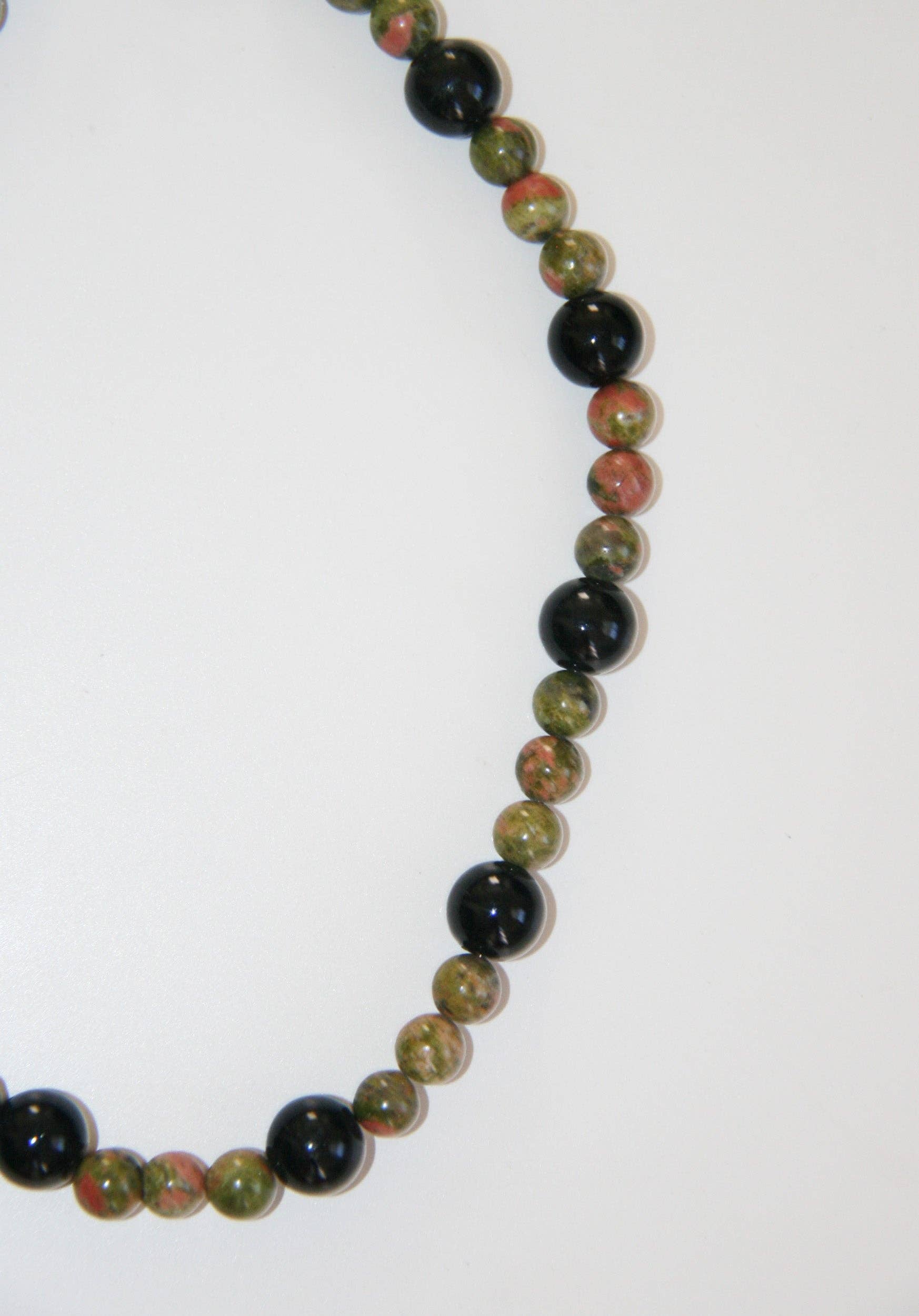 A distinctive stone Unakite, with green and peach hues arranged in a symmetrical design, accented with larger black onyx beads.