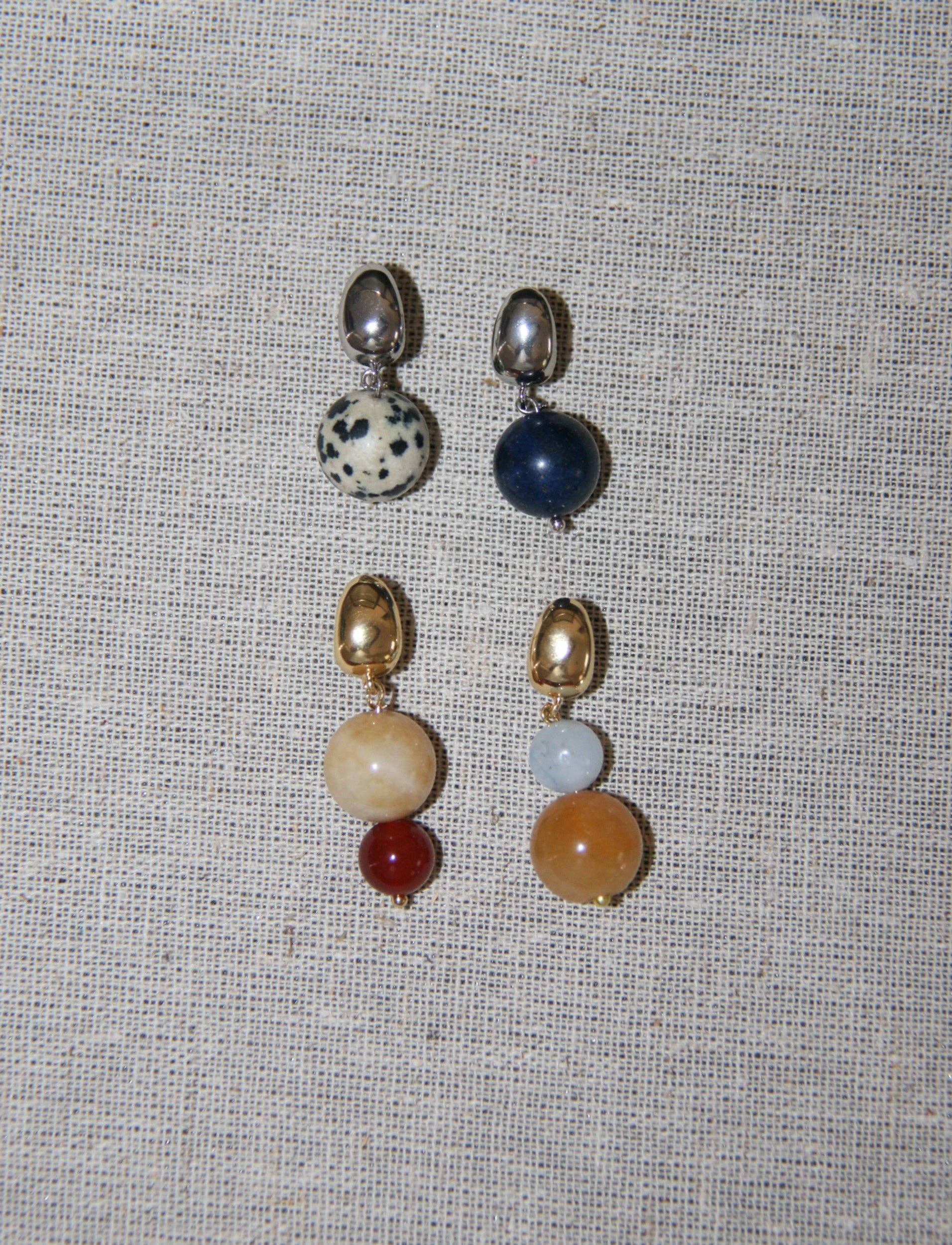 Mismatch gemstone drop earrings. Featuring a smooth metal teardrop earring post, each pair offers a different stone that compliments its partner. Material: Lapis, Dalmatian Jasper. 11x7mm Metal Earring Post * 8mm and 12mm Beads * Silicone Push Back Closure