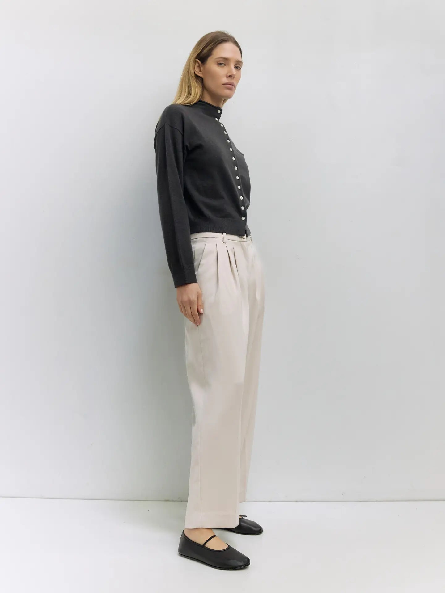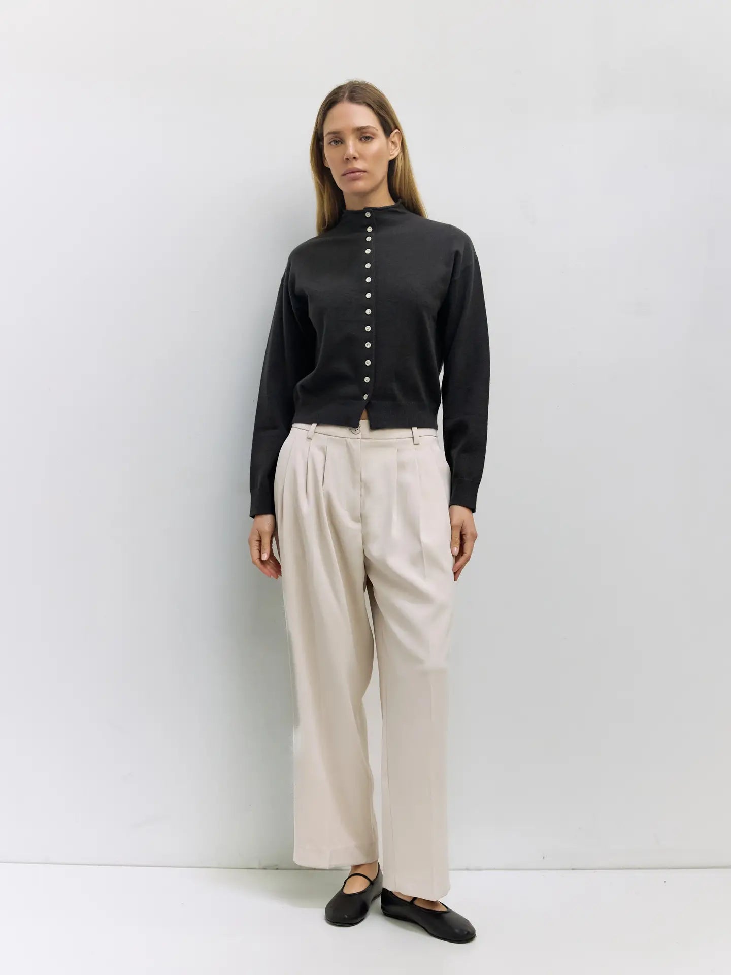 The Brooks Cardigan is a relaxed, high-neck silhouette crafted from midweight sweater knit for a cozy, structured feel. Featuring a turtleneck, drop shoulders, long sleeves, and full button front, it offers timeless layering with modern ease.