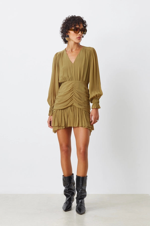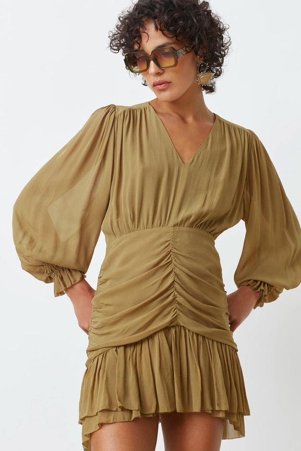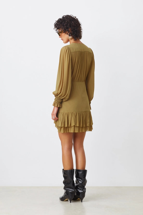 Step into the season with the Clelia Dress in Nature Sage- a playful muslin short dress that flows with draped details and flirty ruffles. Tightened cuffs add a charming touch, while a hidden side zipper keeps the look seamless. Crafted from 100% FSC-certified viscose, it’s a light, eco-friendly piece.