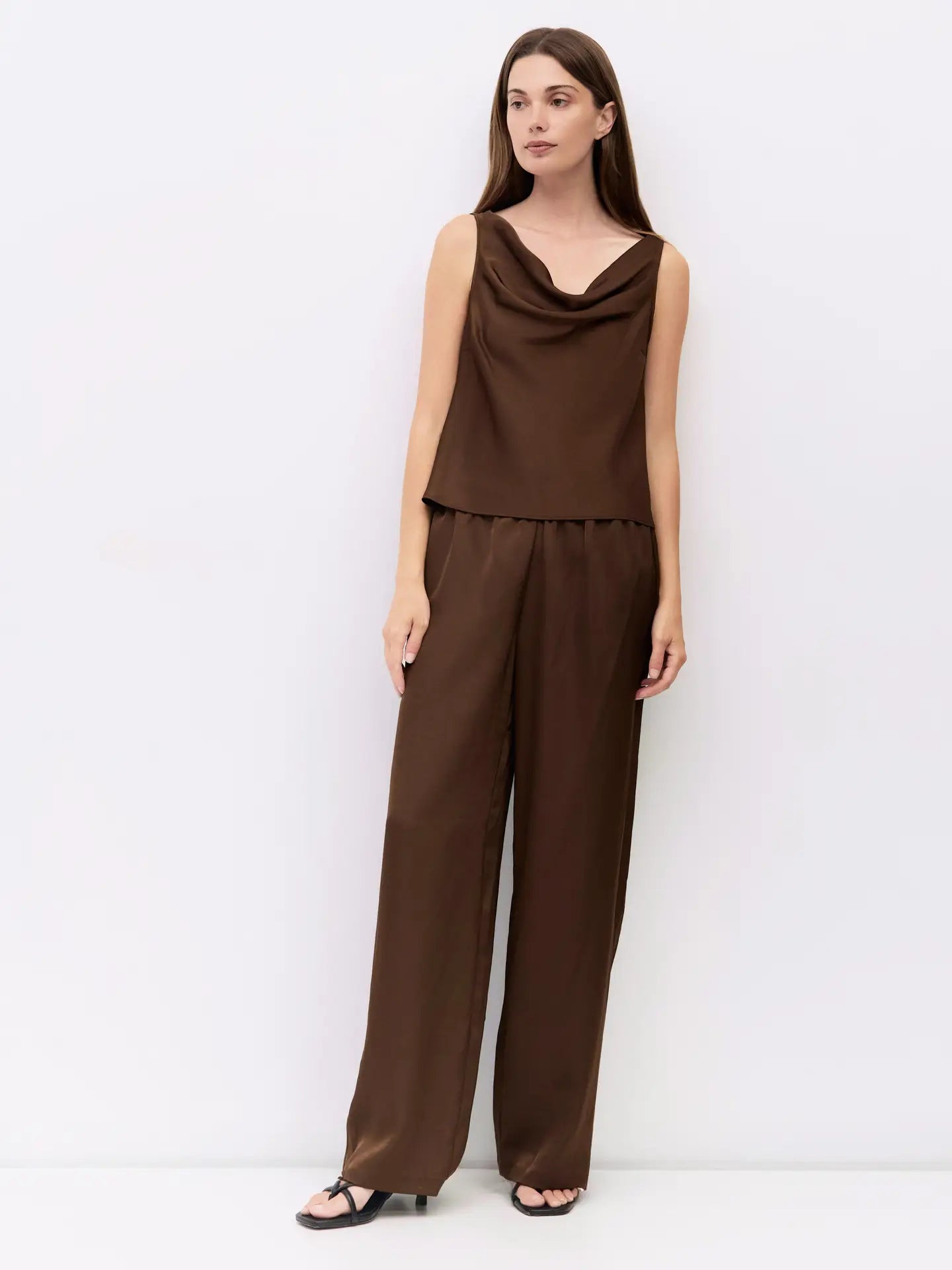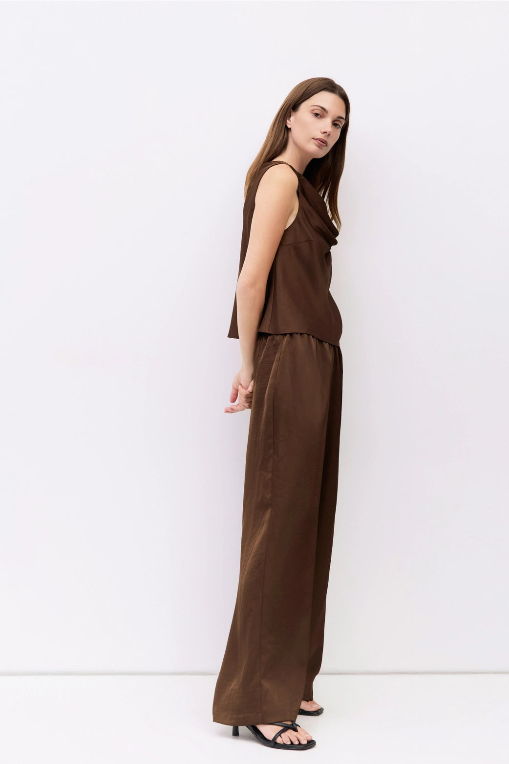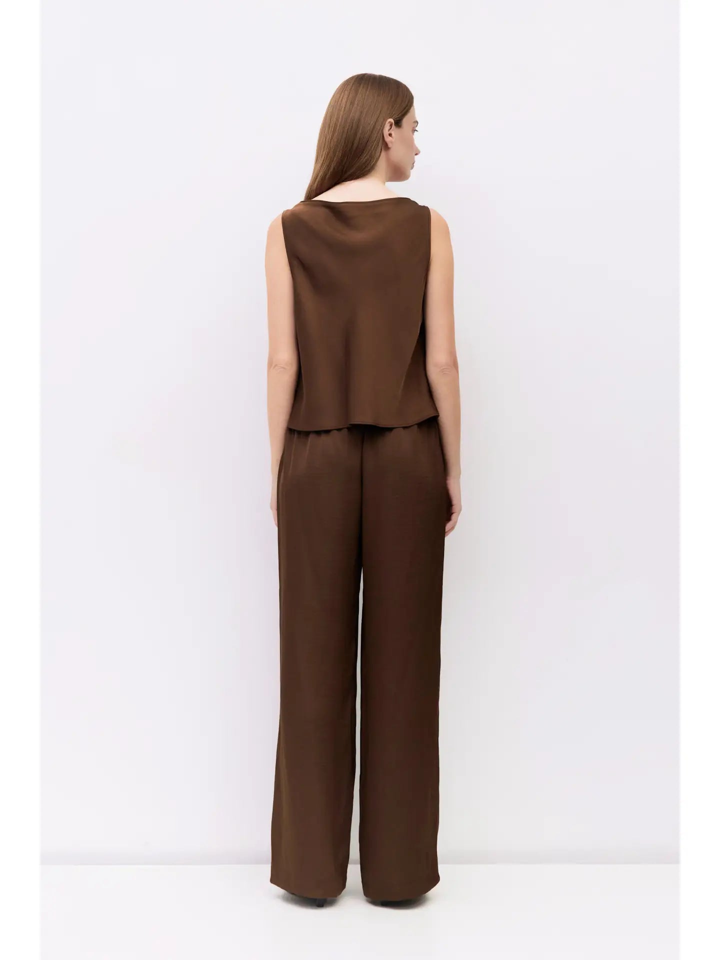 The Denver Pants are made from crushed satin in a rich chocolate brown with an elastic waistband and wide legs for a relaxed, easy fit.