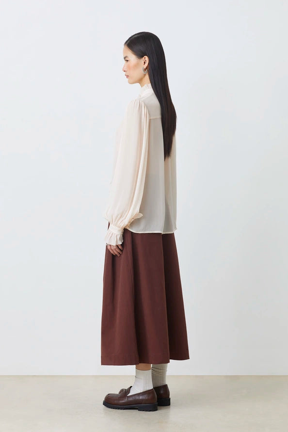 The Leonor Blouse is a breezy, ruffle-adorned favorite- crafted from crepe muslin. features a high ruffled neckline, buttons down the front in matching tones, and snug cuffs with charming ruffles. Made from 100% FSC viscose, it feels as good as it looks.