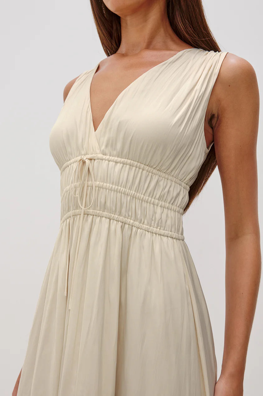 The Lilith midi dress features a plunge neckline crafted from a supple rayon crepe. With smocking, wide straps and an adjustable back strap, the Lilith has a flowing silhouette that cinches at the waist.