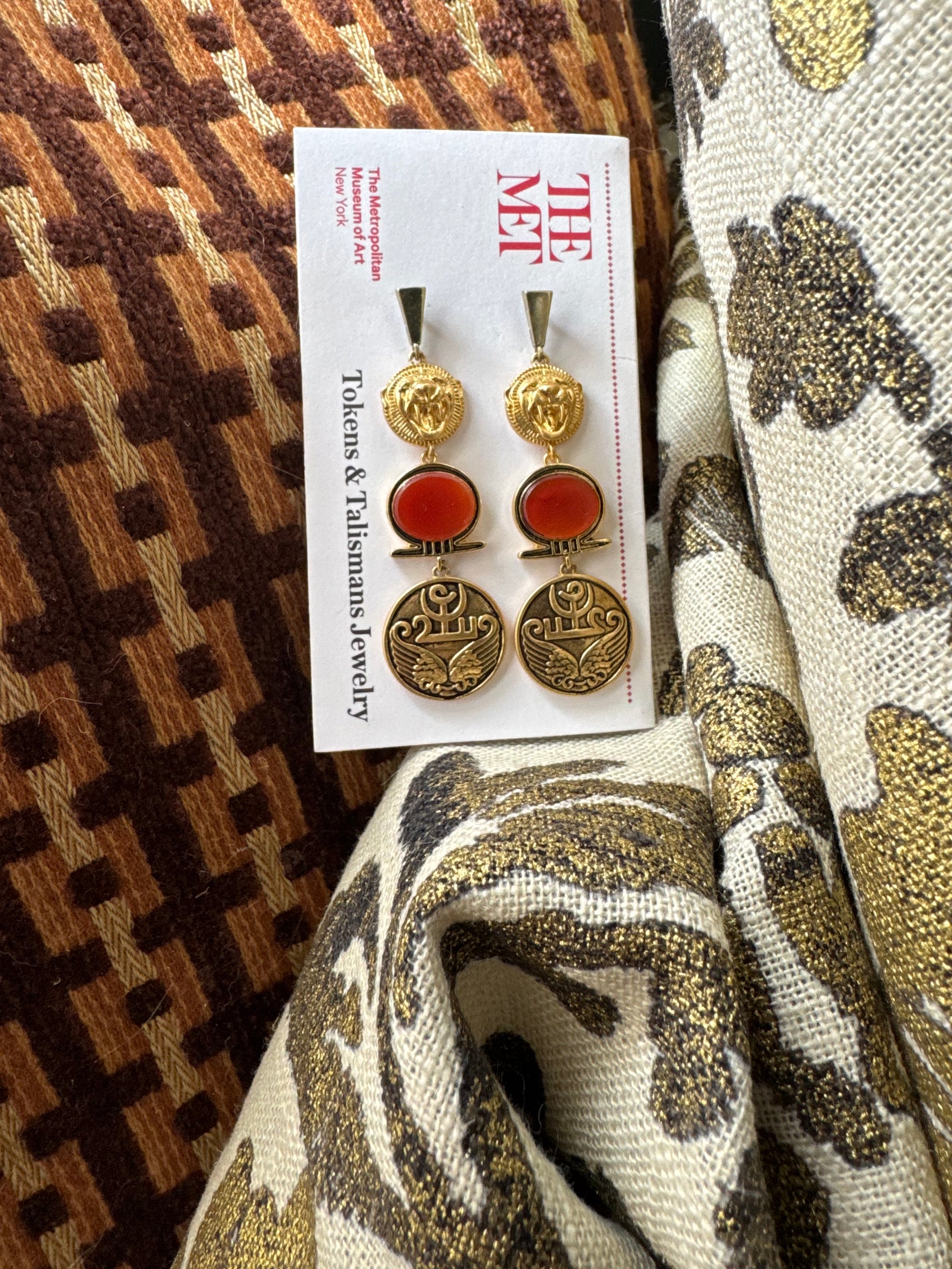 This is a modern secondhand piece for our Spring Anniversary Collection. The Tokens & Talismans drop earring by The Met. In 14K gold plating with Carnelian, a form of quartz. Within the earring is: A Gold Lion-Head Pendant From Cyprus (2Nd Half 5Th Century B.C.); An Egyptian Shen Motto Clasp (Ca. 1648–1540 B.C.); And A Sasanian Wall Panel (Ca. 6Th Century).