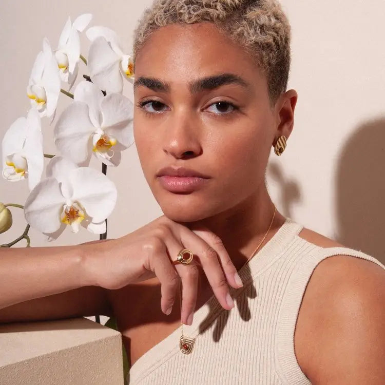 The Mira ring is a substantial ring, inspired by architecture, that fits comfortably. This version has a flat top/flush set with a natural carnelian stone in the center. Gold-plated brass
