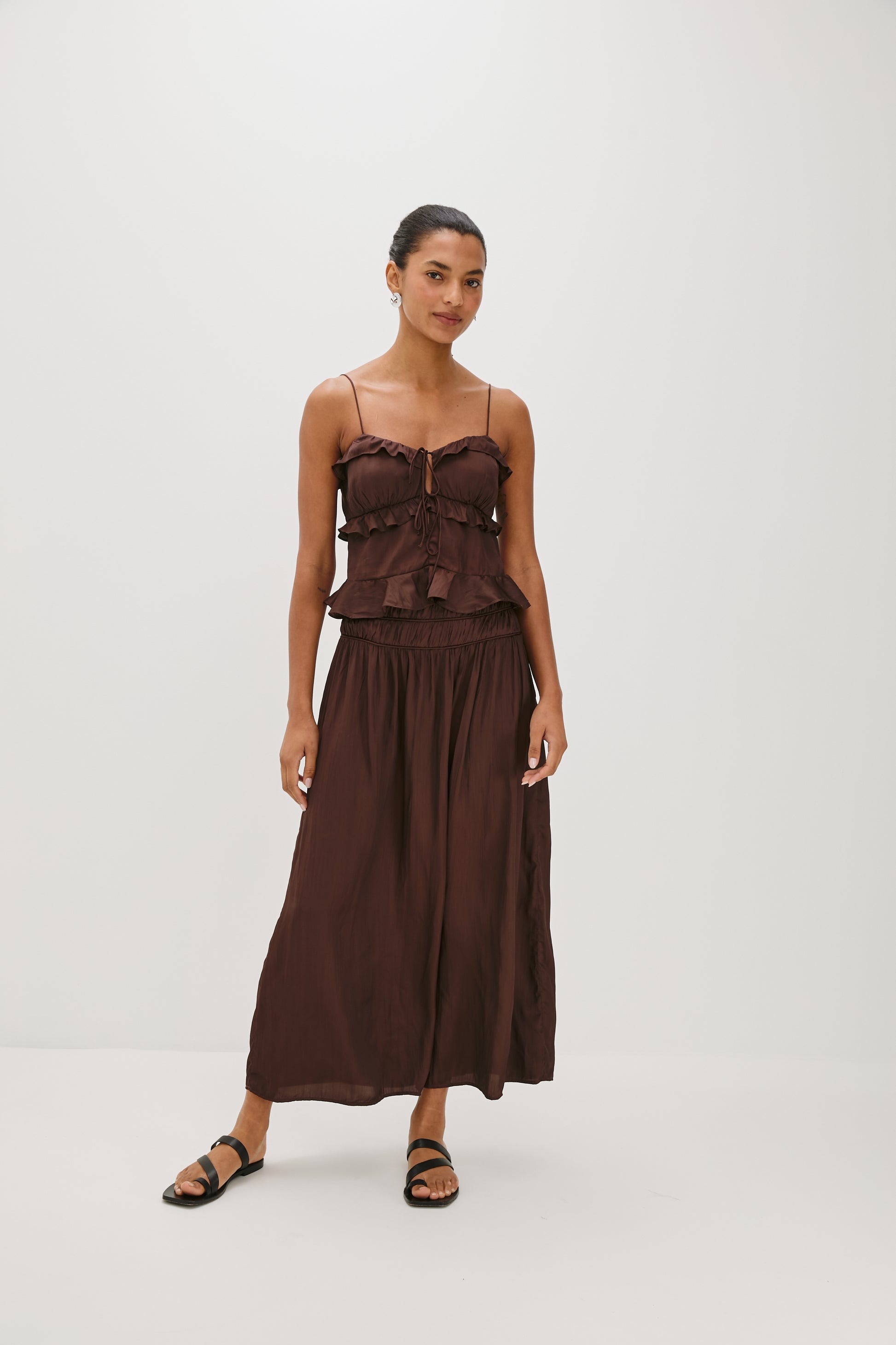 Breezy and endlessly wearable, the Nara Skirt is your go-to for warm days and easy layering. Made from a lightweight, crinkled fabric in a rich cocoa tone, it features a comfortable smocked waistband and a relaxed flowy silhouette that moves with you. Pair it with our matching Ortona top for an elevated event, or with a simple tee or linen button-down for a more undone vibe.