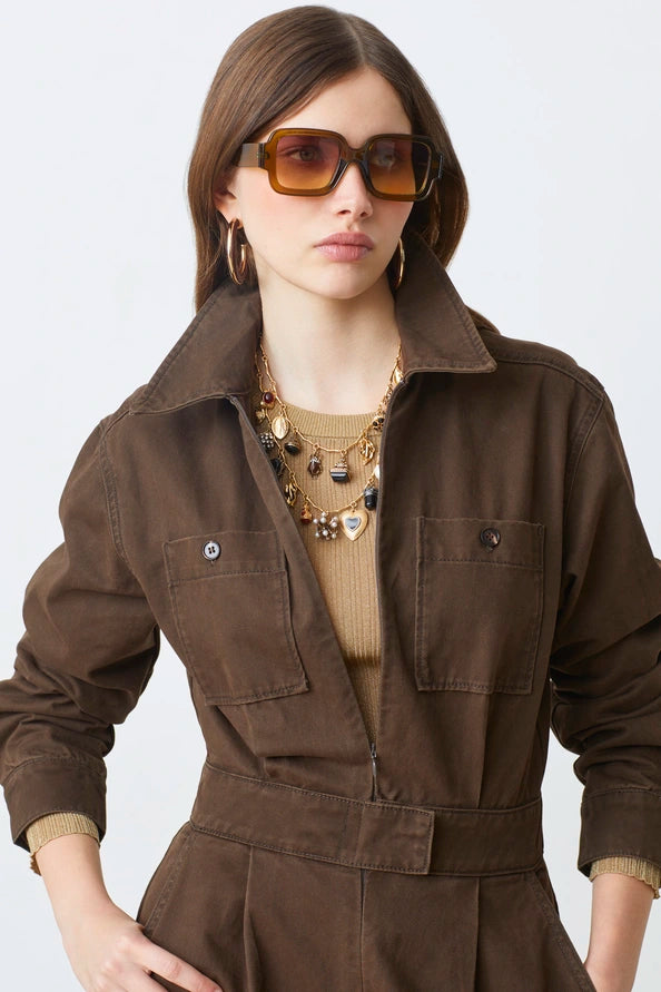 The Torino Jumpsuit in chocolate features a front zipper closure, complemented by two patch pockets on the front and two additional side pockets. It includes discreet hooks and eyes beneath the waistband and is crafted entirely from 100% organic washed cotton.