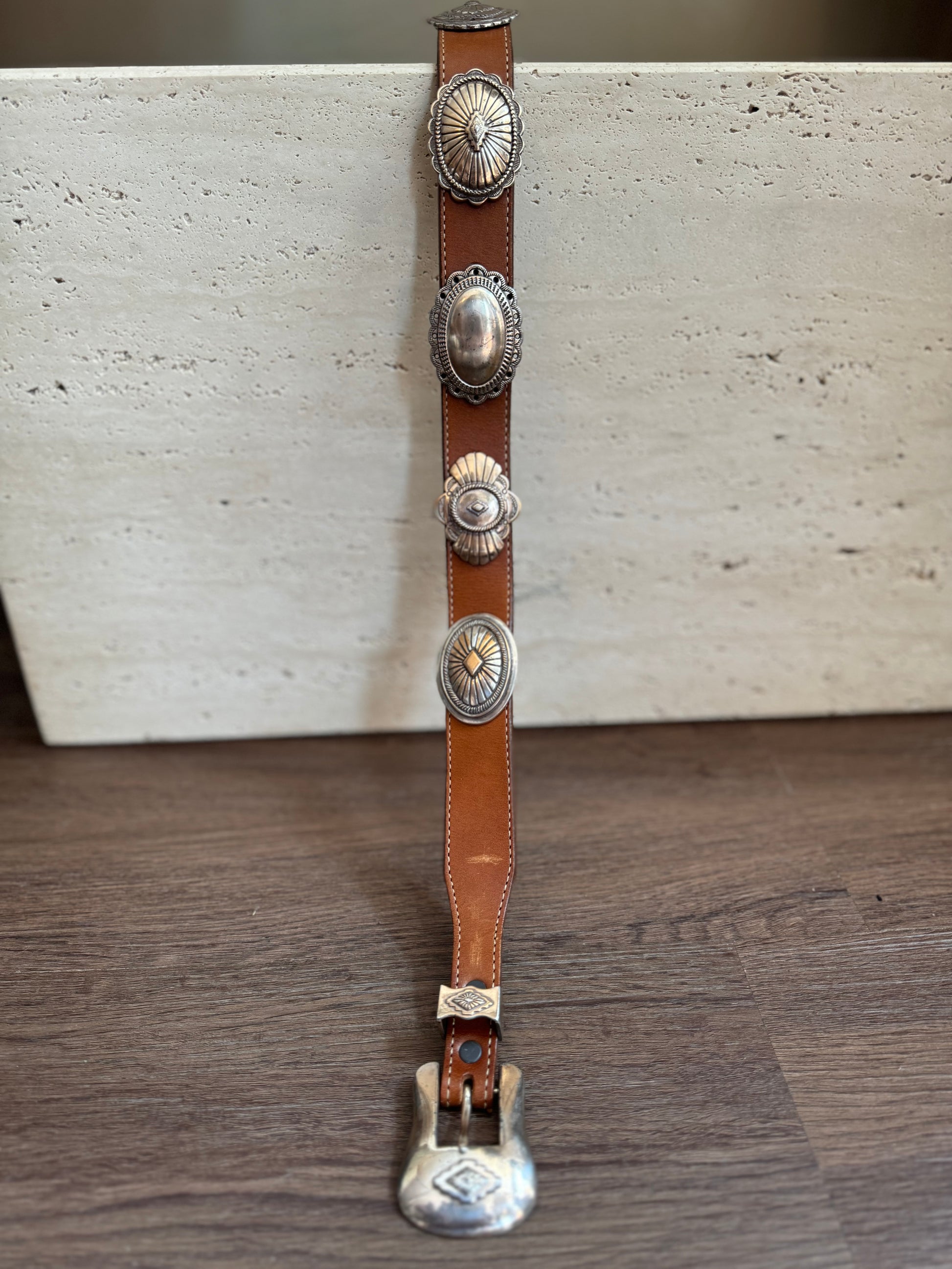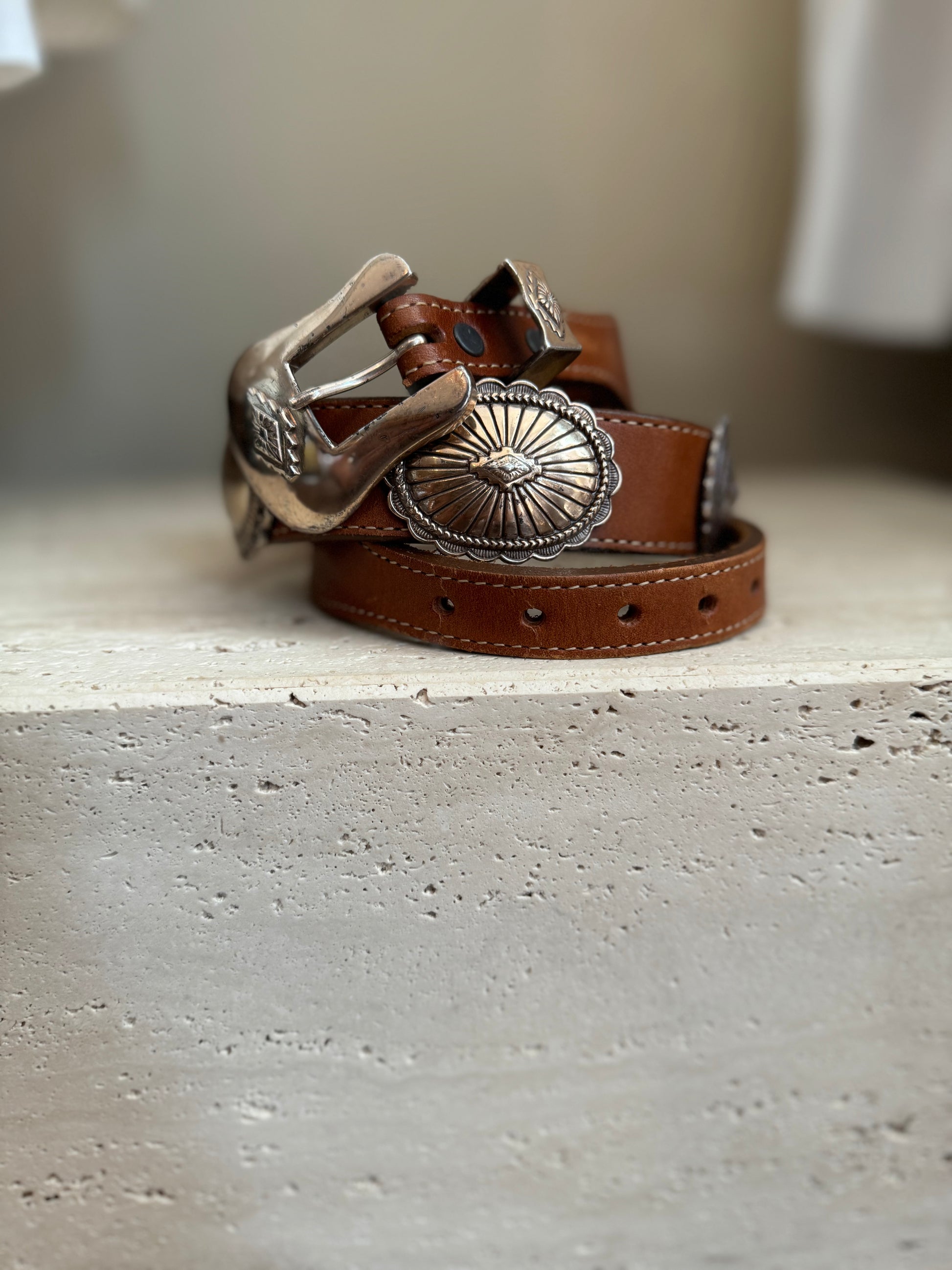In good vintage condition. Minor wear along leather and on silver buckles. Will style beautifully with a white cotton dress or on the hip with a black slip skirt.