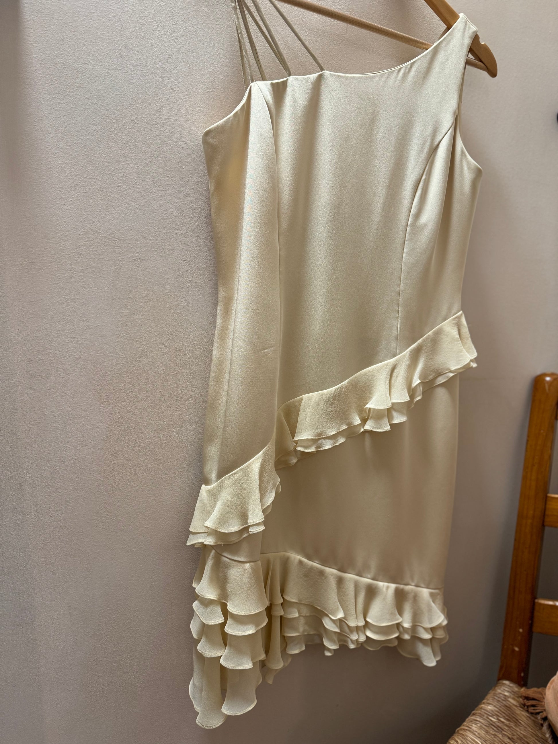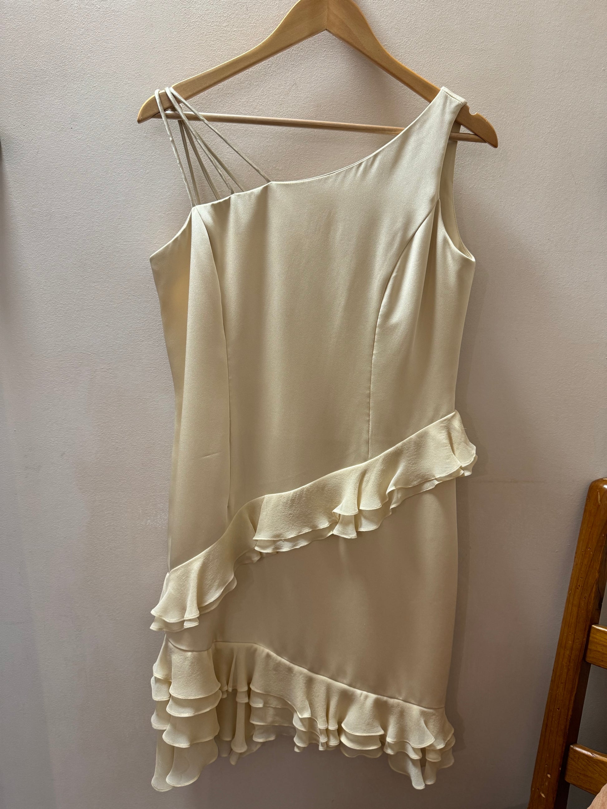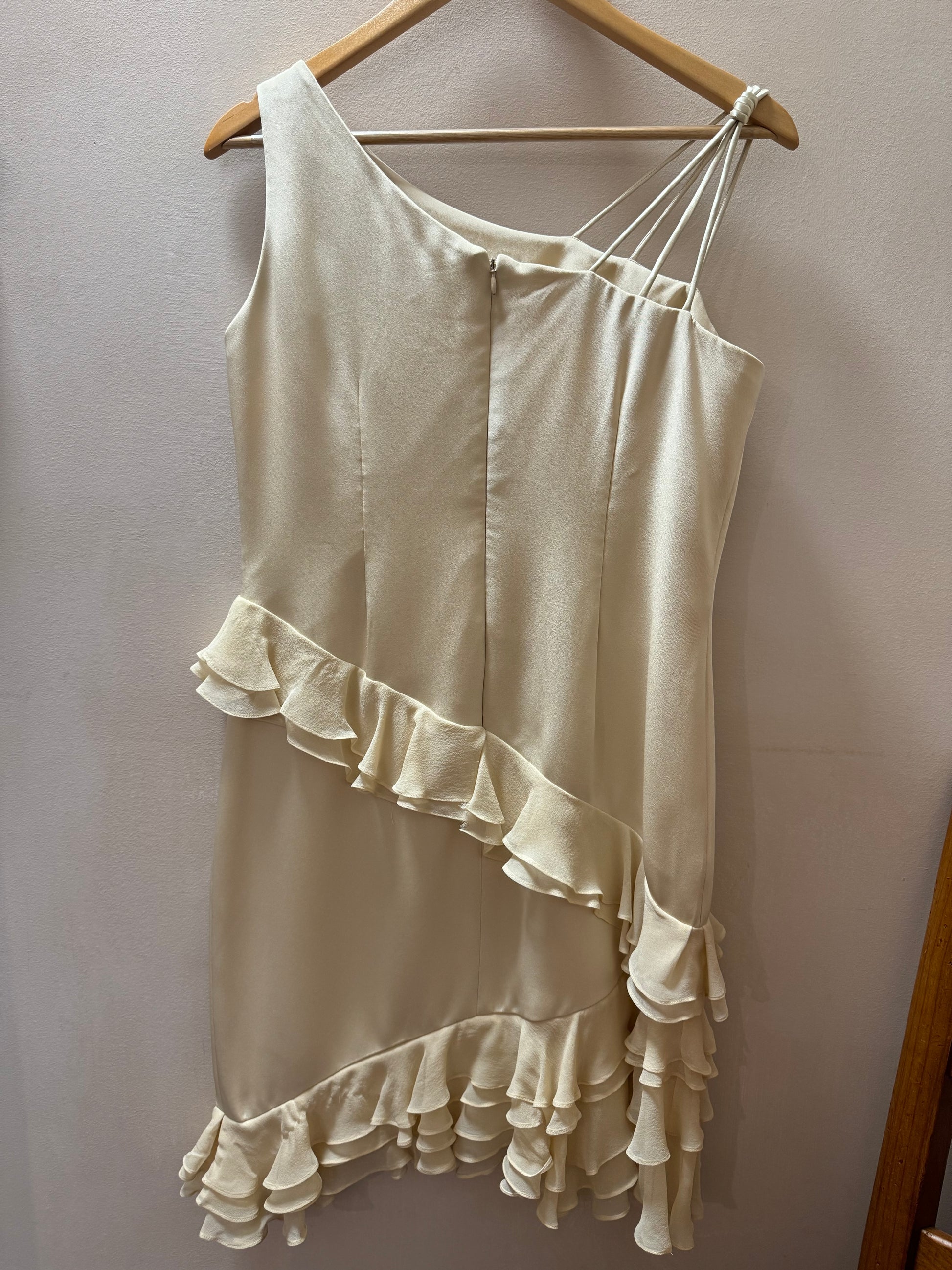 Style Features: Asymmetrical straps, ruffles, silk lined, zipper in back