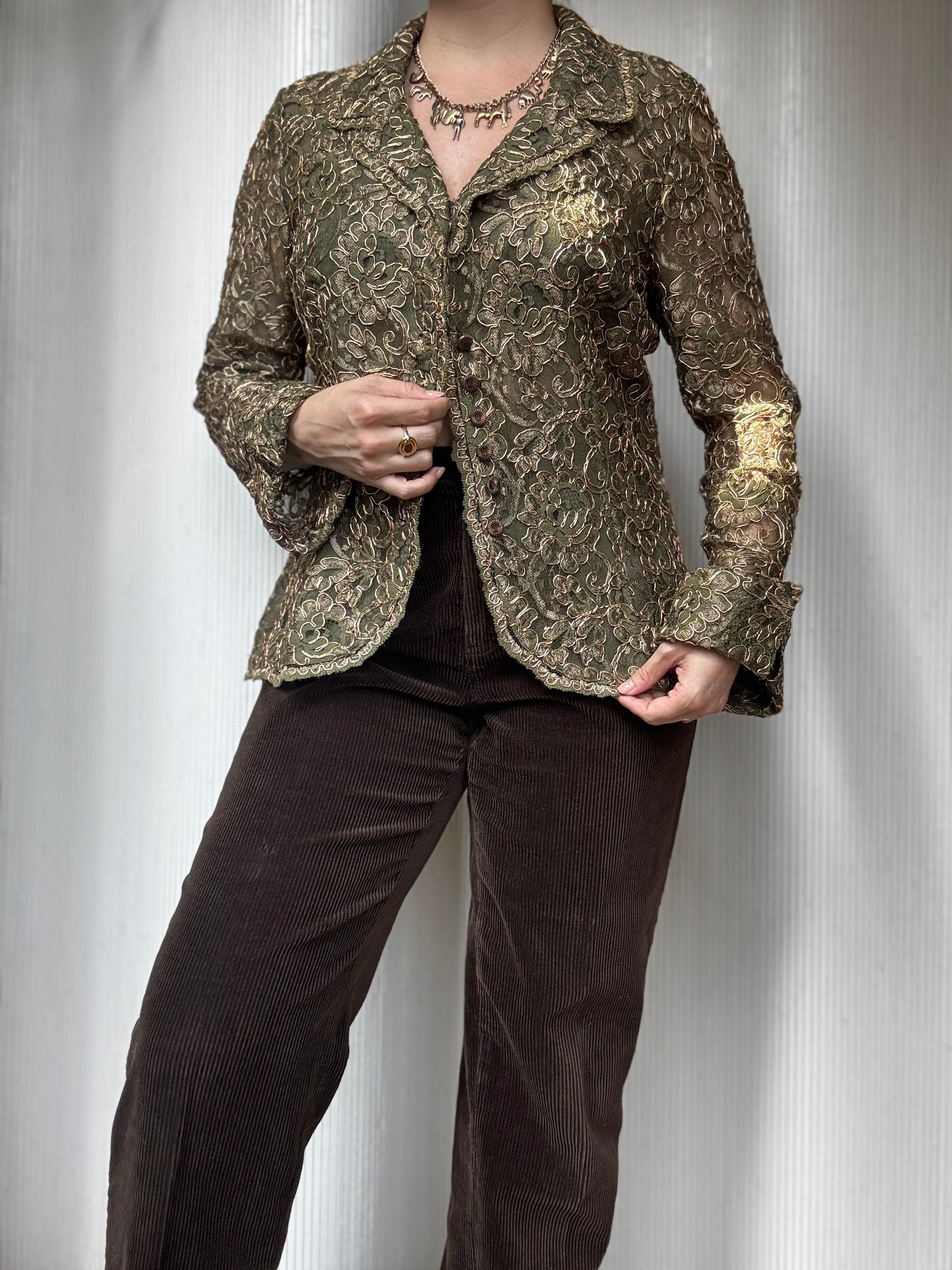 Embroidered olive green lace and gold trim with under bust detail. In excellent condition with no rips, tears, or stains.
