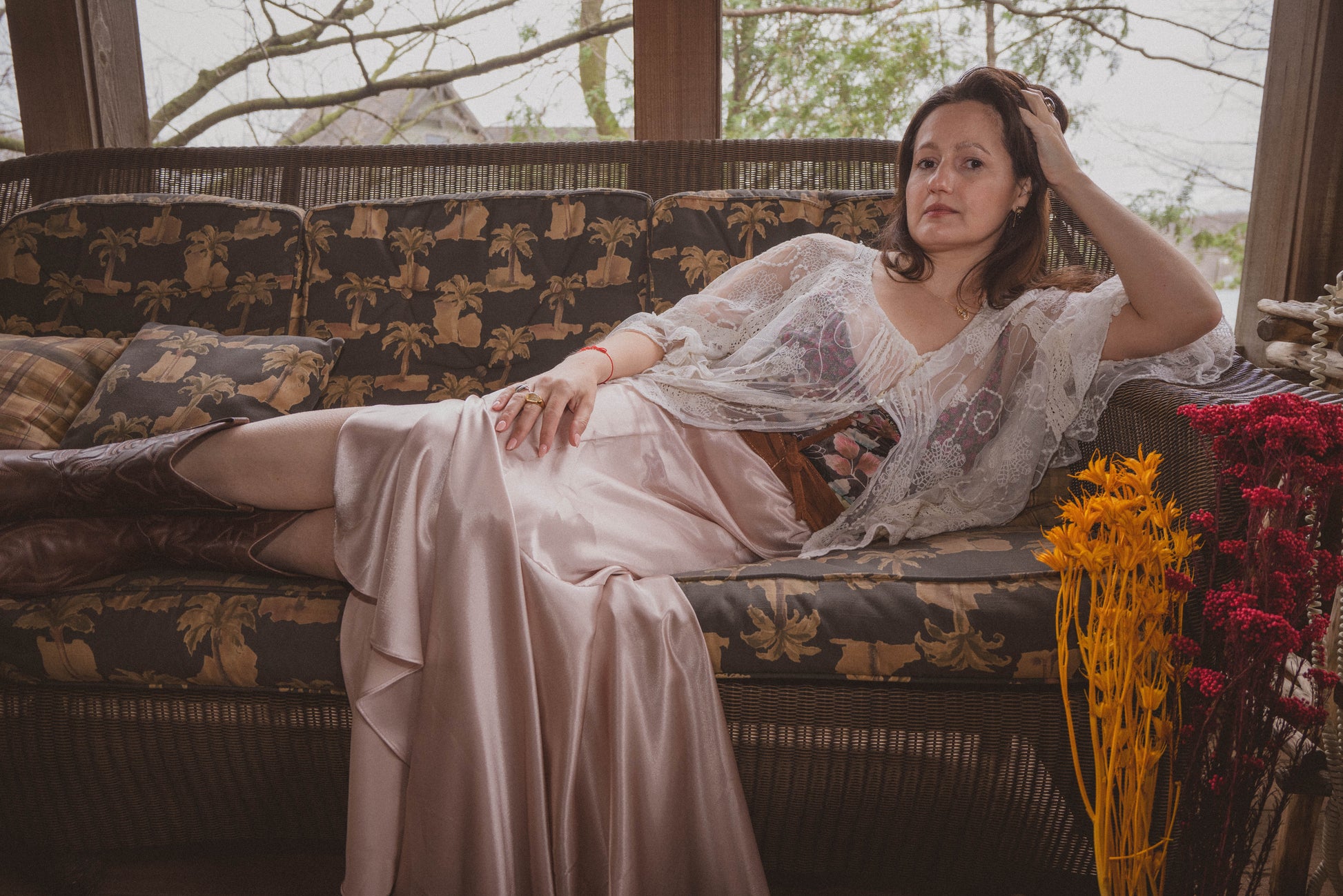 This is a vintage item for our Spring Anniversary Collection. Designer is Cachet by Bari Protas. The Rosewater slip dress drapes flawlessly in a soft blush satin fabric with a vintage drop waist and fluttery long ruffled hem, making it move with the flow of the music or the wind. Pair with a lace knit shawl or oversized sweater for a lived in romantic touch.