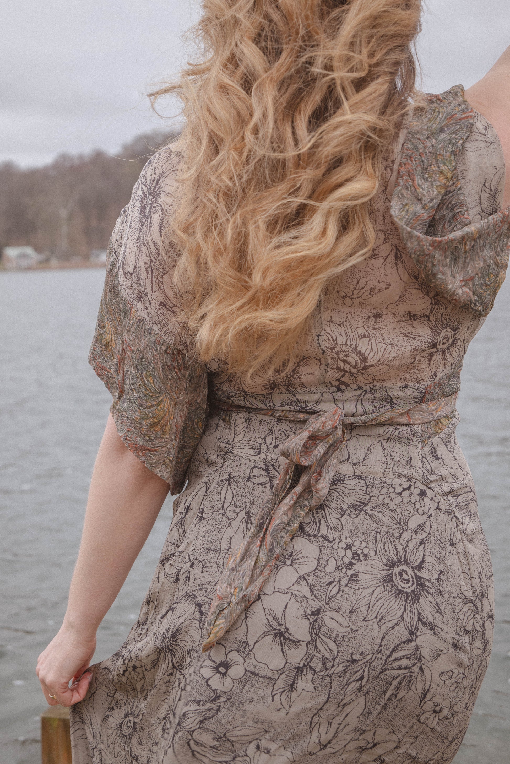 Made of 100% silk with no major signs of wear. The Kate Garden Dress comes in a beautiful subdued, yet rich color way with a woodsy floral pattern, perfect for a year round look