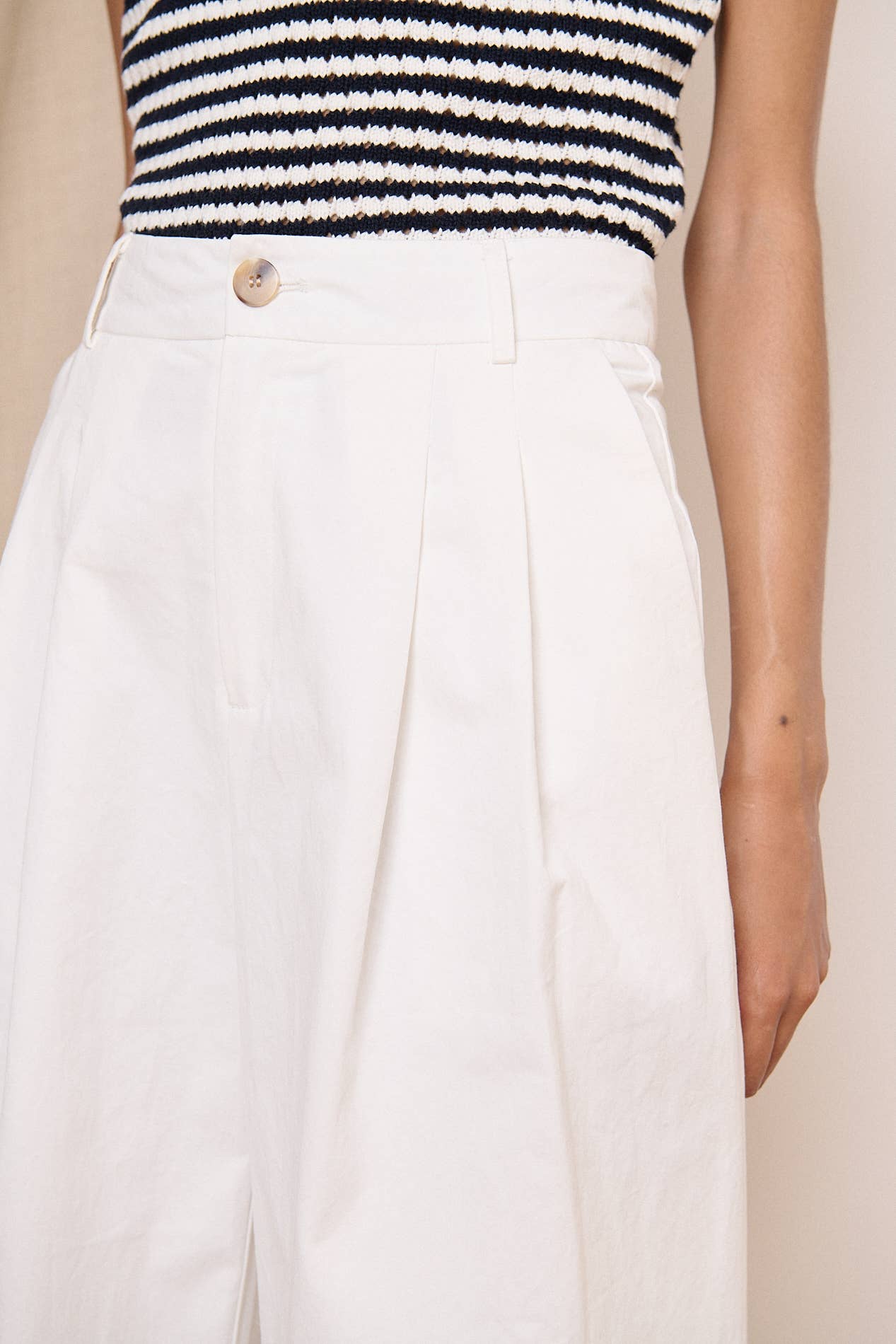 A warm weather favorite. These tailored beauties have a fluid wide-leg silhouette with a high waist and front pleats. Made of 100% cotton, you'll want to live in these from morning coffee walks to evenings out. Style features include a high waist with belt loops and two Italian pockets at the front with two additional faux pockets on the back.