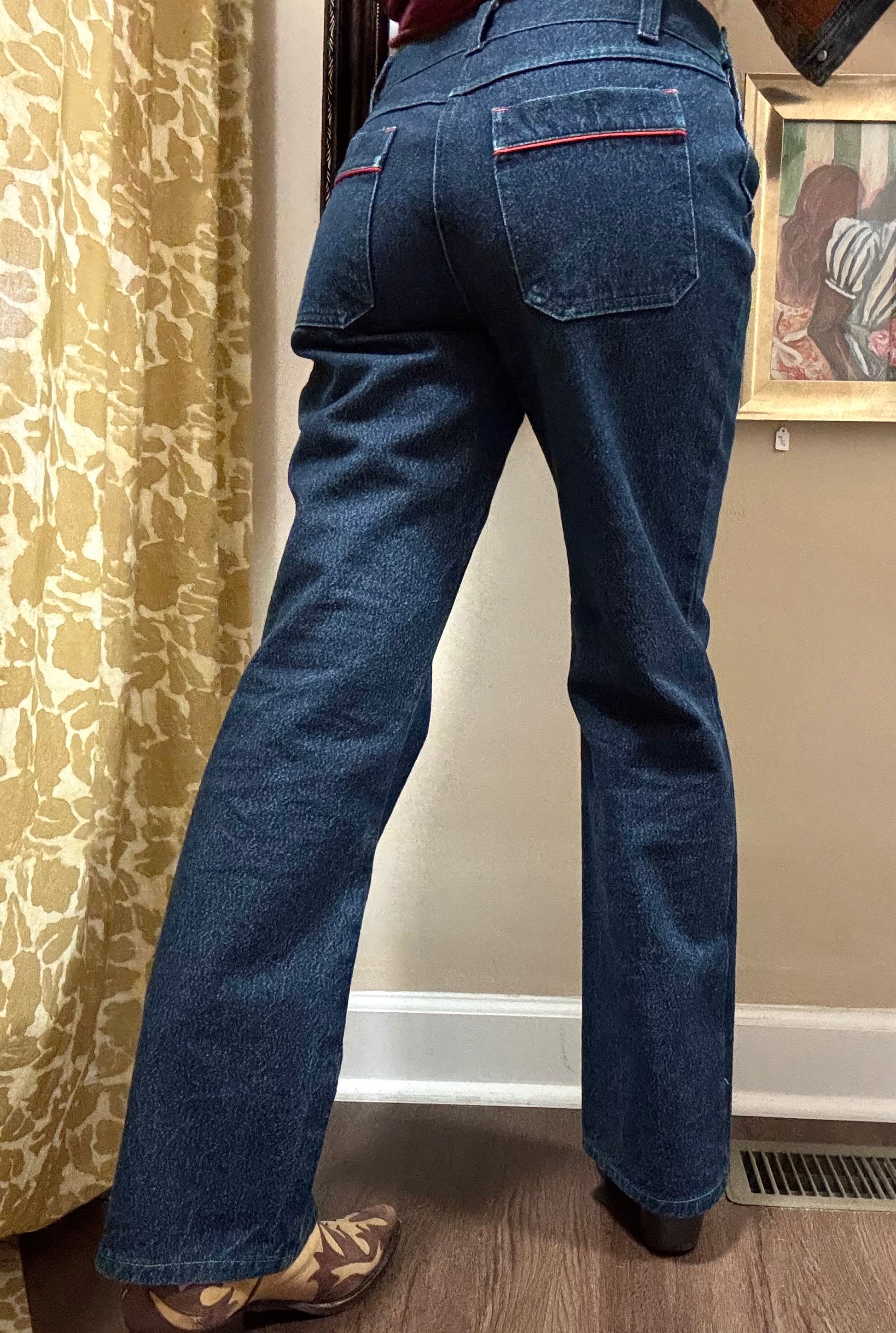 Rare early 2000's Dolce & Gabbana Bavarian German low-rise straight jeans. Featuring a faux lederhosen and inner embroidery along the waist, red trim details. In excellent vintage condition. See photos for details.